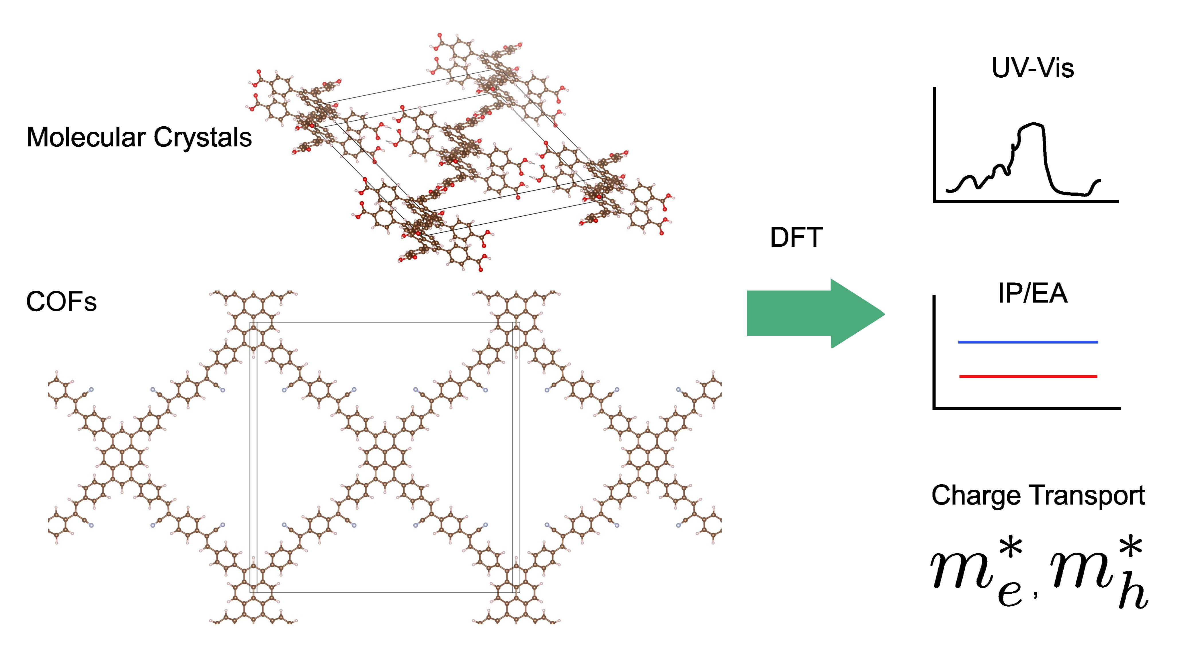 Organic crystalline materials are potential candidates for photocatalytic overall water splitting (OWS) which is of significant industrial importance for the production of green hydrogen for use as a fuel or chemical feedstock.1–3 Extended metal-free crystalline materials such as covalent organic frameworks and graphitic carbon nitrides have been heavily investigated for OWS, where the latter, denser materials exhibit significantly higher hydrogen evolution rates than more porous COFs.1,4 While organic crystals of single molecules have been heavily investigated for organic electronic applications such as OLEDs and solar cells, there has been comparatively much less research into OWS in these materials.5,6 Organic molecular crystals are a promising platform due to their chemical diversity and large range of crystal structures and densities.3 The key question for the design of OWS photocatalysts is to what extent do chemical groups, extended vs molecular structures, crystal packing and density affect the electronic properties? Optical absorption, charge-transport properties, ionisation energy/electron affinity and dispersibility in water are key considerations and are influenced both by molecular properties and crystal structure, making computational modelling challenging.7–9 In this work we shed light on these structure-property relationships by firstly investigating a series of widely known organic electronic materials including molecular crystals and COFs which have published crystal structures, using periodic Density Functional Theory (with the HSE06 functional). Here we analyse the effects of the above structural features on the calculated electronic properties such as band gap, band alignments, optical absorption and charge transport. We then devise a series of both molecular and bulk property descriptors and computationally screen organic materials from crystallographic databases based on these descriptors to highlight new potential OWS candidates.