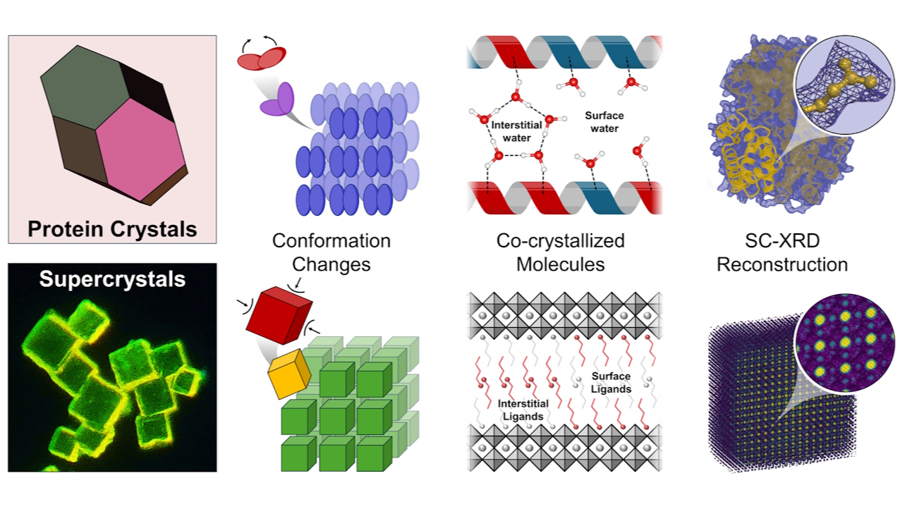 Crystals are defined as solids that display three-dimensional atomic-scale order and produce sharp X-ray diffraction at wide angles. By this definition, colloidal nanocrystal superlattices are not considered true crystals, because cumulative disorder disrupts the atomic periodicity across particles and prevents wide-angle supercrystal diffraction. Thus, superlattices are considered semi-ordered aggregates of nanocrystals, each treated as an independent entity and assumed to remain unaffected by self-assembly. Challenging this assumption, here we show that CsPbBr3 superlattices meet the formal definition of crystals, and can be isolated and measured in a single-supercrystal diffraction experiment. This analysis revealed striking similarities with protein crystals, whose building blocks are comparable in size and complexity to nanoparticles. Like proteins, CsPbBr3 nanocrystals undergo conformational changes upon self-assembly, leading to a measurable lattice contraction and a formal transition to cubic supersymmetry. Like proteins, nanocrystals occupy just 50% of the supercrystal volume, with ligands in the remaining space self-organizing in patterns comparable to structural and interstitial water molecules. Like proteins, the nanocrystal electron density can be reconstructed from single-supercrystal X-ray diffraction, using strategies inspired by structural biology. This evidence prompts a rethinking of superlattices as true crystals of hybrid organic-inorganic phases, and demonstrates that they can serve as tools to study the structure of their building blocks. Following the lead of structural biology, we expect that single-supercrystal X-ray diffraction will provide atomic-resolution insight into elusive features of nanocrystals, such as facet-specific surface structure, ligand density and binding motifs, and the presence of strain fields within the inorganic core.