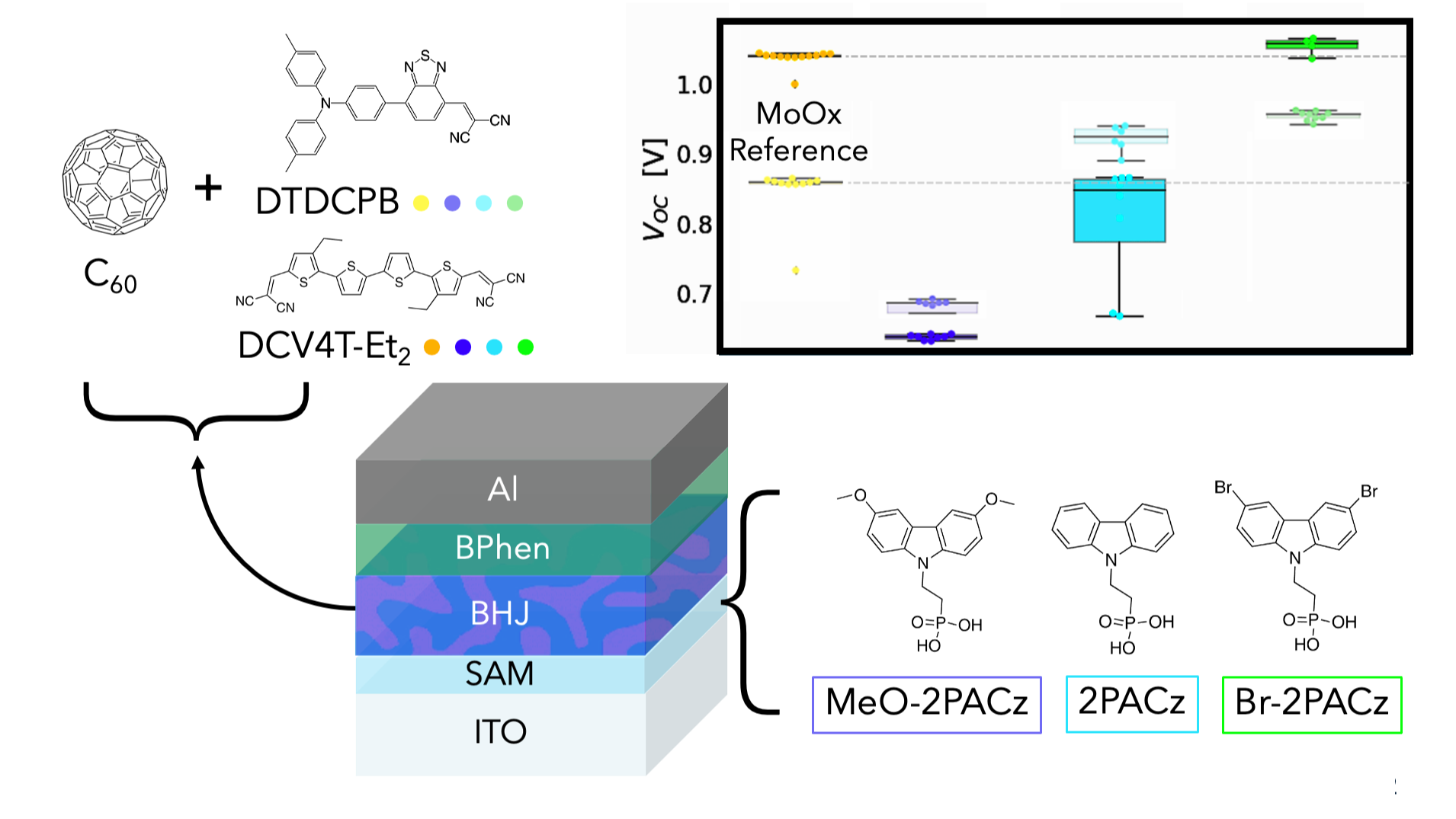 Self-assembled monolayers (SAMs) have previously been shown to perform well as hole-selective layers in solution-processed organic solar cells (OSCs) [1-5]. In this work, we investigated the feasibility of several common spin-coated carbazole SAMs – 2PACz, MeO-2PACz, and Br-2PACz, spanning a range of HOMO levels and work functions from about -4.5 to -6 eV – for integration in vacuum processed fullerene-based OSCs with DTDCPB or DCV4T as donor molecules, with HOMO energies of approximately –5.4 and –5.8 eV respectively. We found that certain SAMs increased the power conversion efficiency of the DTDCPB and DCV4T OSCs by up to 20% and 13% respectively relative to that of our control devices with a standard MoOx hole contact: this relative enhancement in performance was linked to improvements in open circuit voltage (VOC) which occurred if the HOMO of the SAM was below that of the donor. We used capacitance voltage measurements to directly determine the built-in voltage (Vbi) of each OSC and demonstrated that the trend in Vbi closely follows the VOC and the energetic alignment of the different SAMs relative to each donor. These results can be used to help guide future SAM-donor combinations in OSCs. As vacuum thermal evaporation is a readily-scalable fabrication method [6], we seek to make fully evaporated SAM-based OSCs. In preparation for this, we attempted to evaporate the aforementioned SAMs. We have so far found that Br-2PACz degraded during attempted evaporation, but we were able to successfully evaporate 2PACz, in agreement with literature [7]. In this presentation, we aim to compare the fully evaporated device stacks to their solution processed counterparts. We will also complete complementary characterisation to confirm the same energetic changes occur, and we plan to attempt stability testing on these devices.