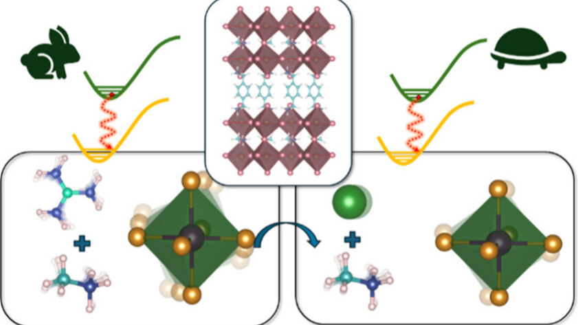 Dion-Jacobson phase multilayered halide perovskites (MLHPs) improve carrier transport and optoelectronic performance thanks to their shorter interlayer distance, long carrier lifetimes, and minimized nonradiative losses. However, limited atomistic insights into dynamic structure–property relationships hinder rational design efforts to further boost their performance. Here, we employ nonadiabatic molecular dynamics, time-domain density functional theory, and unsupervised machine learning to uncover the impact of A-cation mixing on controlling the excited carrier dynamics and recombination processes in MLHPs. Mixing smaller-sized Cs with methylammonium in MLHP weakens electron–phonon interactions, suppresses the nonradiative losses, and slows down intraband hot electron relaxations. On the contrary, larger-sized guanidinium incorporation accelerates nonradiative relaxations. The mutual information analyses reveal the importance of interlayer distances, intra- and interoctahedral angle dynamics, and A-cation motion in extending the excited carrier lifetime by mitigating nonradiative losses in MLHPs. Our work provides a guideline for strategically choosing A-cations to boost the optoelectronic performance of layered halide perovskites.[1]