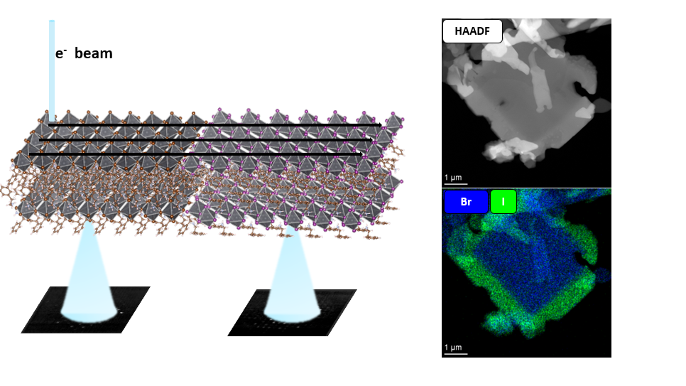 2D metal-halide perovskites are interesting materials due to their controllable optoelectronic properties, such as anisotropic charge diffusion, and composition-dependent tuneable band gap. The 2D perovskite crystals we investigated are organic–inorganic hybrids composed of semiconducting metal–halide octahedral layers sandwiched between two layers of mostly insulating organic cations [1]. This architecture gives rise to highly anisotropic charge transport, with carriers preferentially moving in the in-plane direction, strongly weakening the transport between the two octahedra layers [2]. We exploit this intrinsic anisotropy by growing lateral heterostructures in the PEA₂PbBr₄–PEA₂PbI₄ system, where the higher-band-gap PEA₂PbBr₄ core is surrounded by the lower-band-gap PEA₂PbI₄. This configuration enables directional charge or energy flow in the in-plane direction from the core toward the surrounding material. Going beyond conventional optical characterization, we employ Scanning Transmission Electron Microscopy, including both compositional analysis using Energy-Dispersive X-ray Spectroscopy (EDX) and scanning electron diffraction (4D-STEM). 4D-STEM is particularly insightful as it enables probing of the crystallography at high lateral resolution (probe size ~few nm) with very limited electron dose (dose < 1 e-/Ả2), preventing damage to the sample [3]. Combining powder X-Ray diffraction with nanoscale diffraction provides a complementary set of information with both ensemble and single-particle insight.