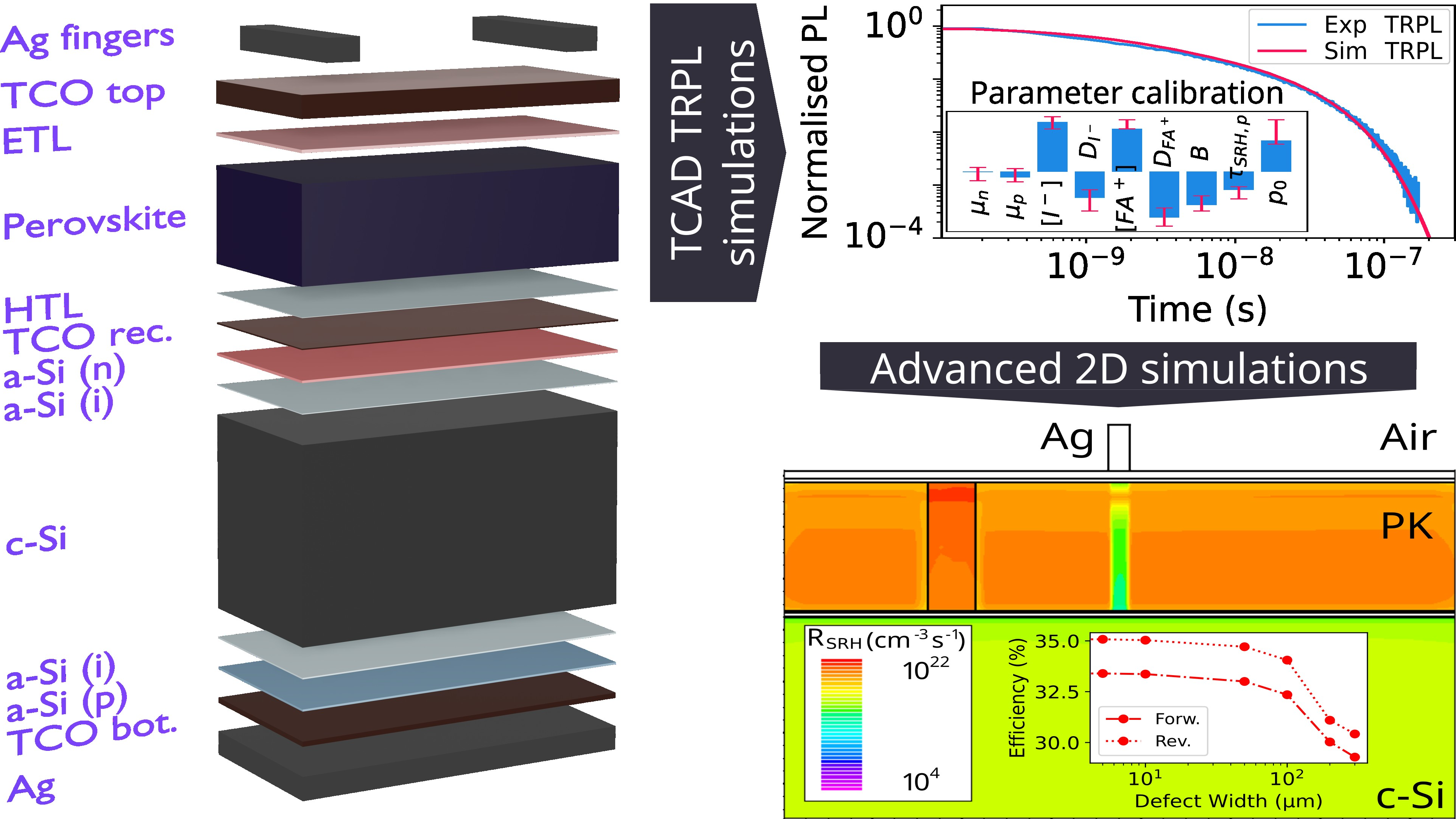 As stated above, an important innovation of the present work is the 2D engineering of the TCAD model, including an electrode (see Figure, bottom). This opens the way to investigate the impact of inhomogeneities in real-world systems. Indeed, in the process of cell fabrication, defects may occur (device handling, layer growth, ...). Their impact on cell efficiency might be dramatic since locally the junction separating holes and electrons might not be present anymore, creating a ”shunt” in the device. Also, defects in the bulk of the PK absorber might act as deleterious recombination centers. The present demonstration features a defect in the PK with a hundredfold lower SRH lifetime, simulating for example a highly defective PK grain. Its width was swept to yield the bottom inset in the Figure. Interestingly, Voc and Jsc seem not to be affected by these defects, contrarily to the FF that dramatically drops when the width increases from 1 to 300 μm. On the Figure (bottom), the extracted SRH recombination rate proves that losses occur at this defect, rather close to the front surface.