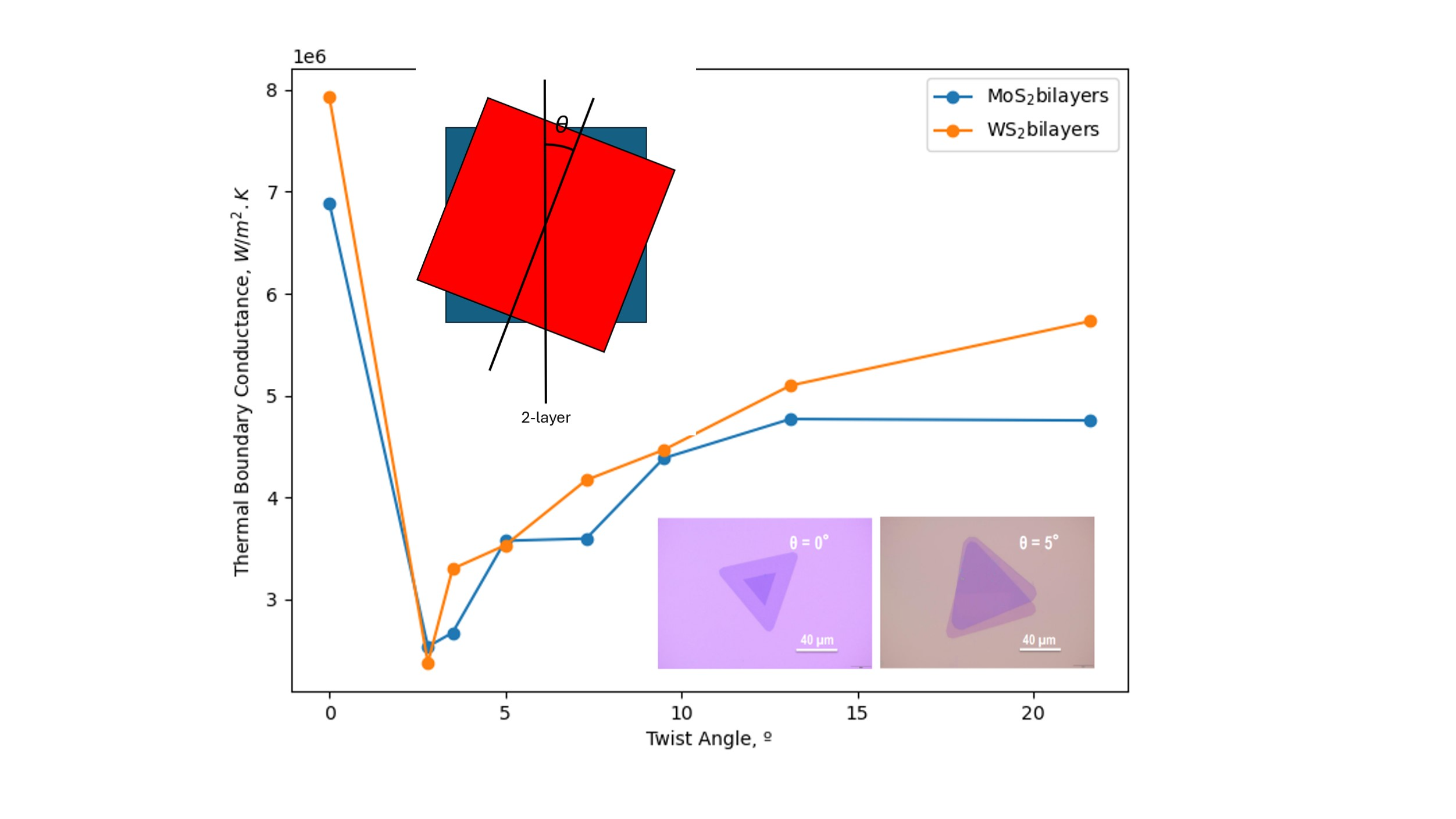 Theoretical studies suggest that both cross-plane and in-plane thermal transport in 2D materials are highly dependent on twist angle, as it modulates interlayer phonon coupling, thereby affecting phonon transmission and scattering. These effects are particularly pronounced at small twist angles (0–5°). However, precise fabrication of high-quality, twisted bilayers with small-angles remains challenging, and experimental validation of theoretical predictions is still limited.