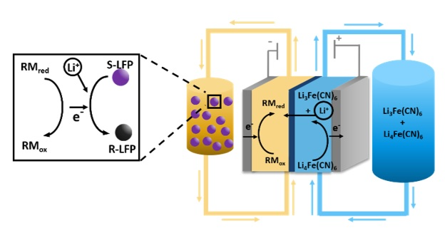 In this work, we describe a novel and scalable method for the direct electrochemical recycling of lithium iron phosphate (LFP) from discarded LiBs, using a flow cell and the redox mediation process. Electrochemical recycling using redox mediators effectively restores the oxidation state of iron and facilitates the reinsertion of Li ions, effectively addressing the main degradation mechanism of cathode LFP. In this procedure, pellets of degraded LFP powder (S-LFP) are placed in a tank, where they are directly reduced and relithiated by a redox mediator (RMred) dissolved in an aqueous electrolyte containing lithium (relithiation anolyte), pumped from an electrochemical cell into the relithiation tank. Redox mediators transport charge from the electrochemical cell, where Li₄Fe(CN)₆ is oxidized, to the S-LFP pellets, while Li ions are supplied from a counter compartment containing Li₄Fe(CN)₆ through an ion-selective membrane. Consumption of the redox mediator regeneration solution is minimal thanks to a closed-loop electrochemical regeneration process. The concept is validated using two different redox mediators, each associated with different energy demands in the recycling process. The total regeneration of the S-LFP is confirmed by structural and electrochemical characterization, showing that the regenerated material has a crystalline structure comparable to that of the LFP in a new cathode.