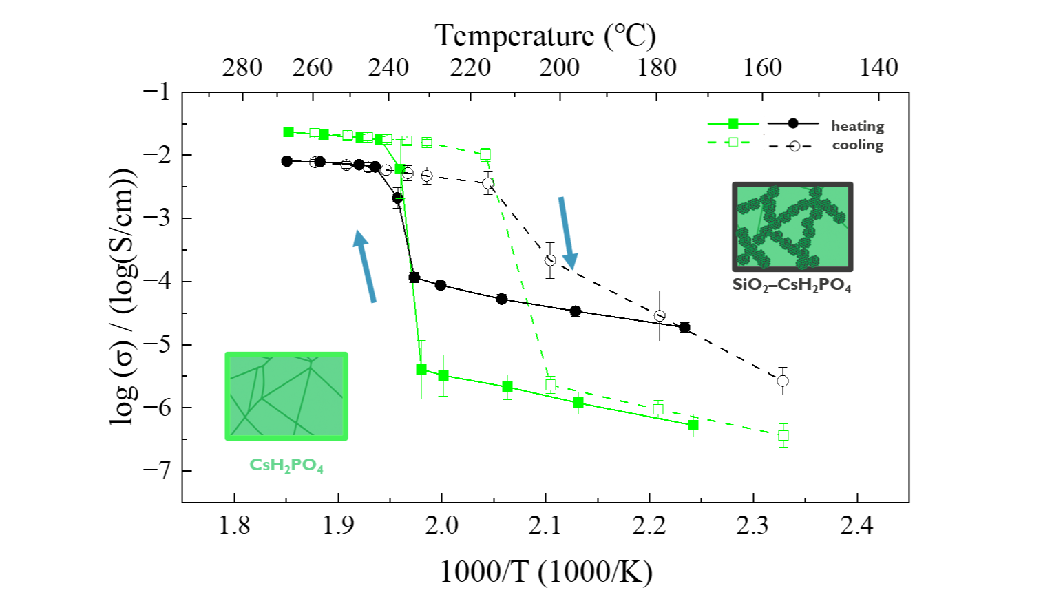 Medium-temperature electrolysis (MTE, 200 °C < T < 400 °C) is emerging as a promising pathway for hydrogen production and CO2 reduction.[1] This temperature range offers improved thermodynamic efficiency and more favorable electrode kinetics compared to low-temperature electrolysis as well as greater materials’ flexibility compared to high-temperature systems.[2] Among medium-temperature protonic conductors, cesium dihydrogen phosphate (CsH₂PO₄, CDP) stands out due to its high conductivity after phase transition (from low conductive monoclinic phase to highly conductive or superprotonic cubic phase) and chemical stability under humidified conditions, making it a promising electrolyte for MTE applications.[3] However, practical deployment of CDP is hindered by its restricted performant temperature range. To address these issues, researchers have focused on utilizing CDP-based composites, often by incorporating inorganic nanoparticles such as SiO₂[4] or SnO₂[5]. Such composites might benefit from the space charge layer formed at interface, which can significantly improve the overall proton conductivity.[6]