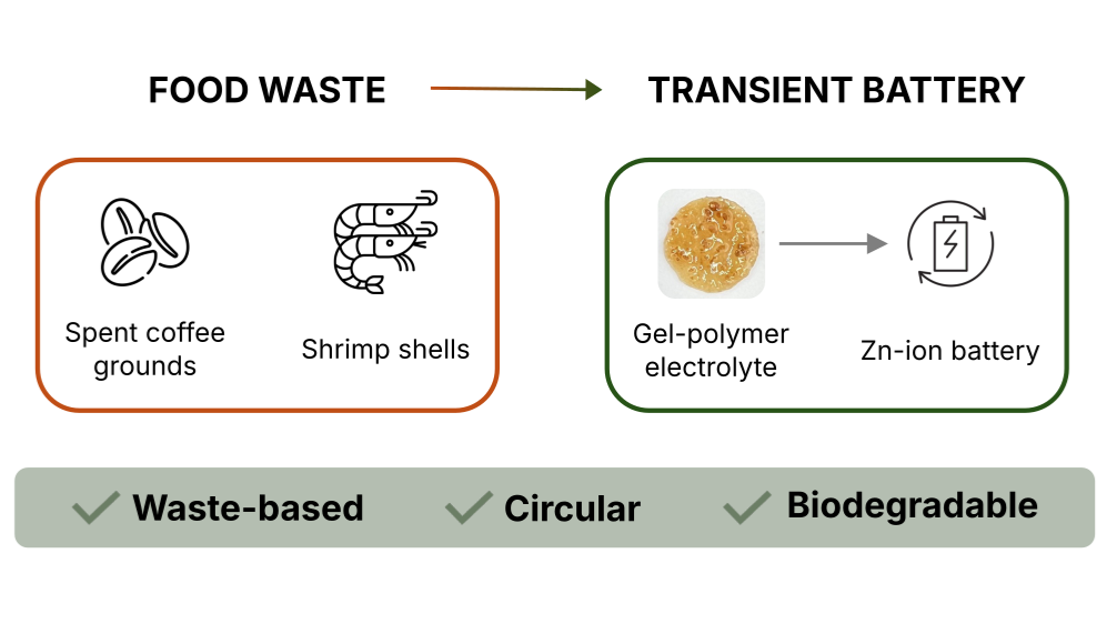 In this work, we propose a solution to this challenge and develop a Zn-MnO2 battery derived from waste products. The use of waste materials represents a unique opportunity to align with the principles of a circular economy. Despite increasing recycling efforts, some waste inevitably exits the valorisation loop of a circular economy. Reintroducing certain waste products into this cycle therefore not only creates value from otherwise discarded materials, but also lowers the resource loss when transient devices are degraded at their end of life. We focus on the food waste stream, as food products are bio-based and non-toxic, showing inherent potential for biodegradable devices. Specifically, we revalorize spent coffee grounds and shrimp shells waste to produce a gel-polymer electrolyte (GPE). We show that this waste-based GPE meets the requirements needed for incorporation in aqueous battery systems, with an ionic conductivity of 22 mS/cm, an electrochemical stability window of 2V and a Young’s modulus of 40 kPa. The developed GPE was incorporated in a Zn-MnO2 pouch cell battery that achieved an open-circuit voltage of 1.37 V and completed multiple charge/discharge cycles, confirming the feasibility of this approach.
