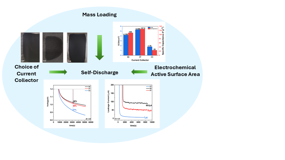 In this study the influence of mass loading and electrochemically active surface area of carbon electrodes was examined on three different current collectors over a range of applied voltages. (Figure 1) The secondary yet beneficial role of ethyl cellulose as a binder towards self-discharge was established and the dominant self-discharge mechanism was identified across all electrodes. The insights obtained here contribute to the development of sustainable supercapacitors with regulated self-discharge and befitting electrochemical performance.
