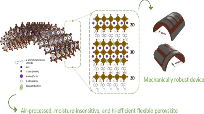 Ambient-air fabrication of flexible perovskite solar cells (f-PSCs) is a crucial step toward scalable and cost-effective commercialization. However, achieving high photovoltaic efficiency, long-term operational stability, and mechanical robustness under high-humidity conditions remains challenging, as moisture-induced defects at both the buried and top interfaces severely deteriorate device performance. Here, we present a stepwise defect passivation strategy using phenethylammonium chloride (PEACl) to form two-dimensional (2D) halide perovskite layers at both the buried and top perovskite interfaces, enabling the fabrication of efficient and highly durable f-PSCs under relative humidity (RH) conditions of up to 50%. Incorporation of 2D perovskite into the hole-transport layer (HTL) enhances moisture resistance and interfacial stability simultaneously. The resulting f-PSCs exhibit a flexible-to-rigid efficiency ratio exceeding 94% and retain 85% of their initial efficiency after 2,800 hours of air storage without additional encapsulation. Furthermore, dual-sided 2D passivated f-PSCs demonstrate outstanding mechanical reliability, maintaining 96% of their initial efficiency after 10,000 bending cycles and 87% after extreme shear-sliding tests. These results highlight the potential of 2D perovskite engineering to enhance both mechanical and environmental stability in f-PSCs and overcome key barriers to their large-scale manufacturing under ambient conditions.