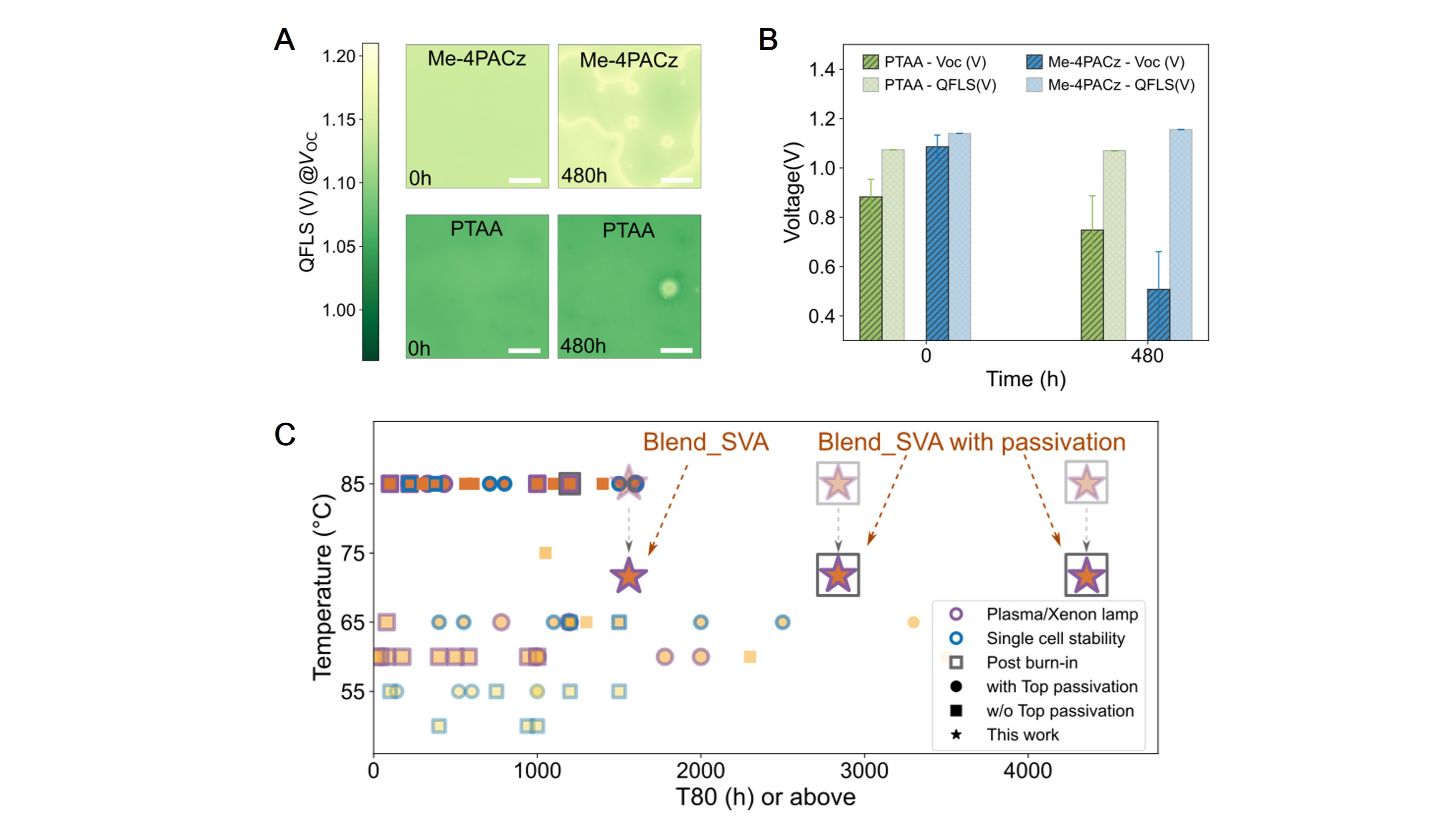 Based on these insights, we developed interfacial strategies targeting both charge-transport interfaces. At the bottom interface, a solvent-vapor-annealed small-molecule/polymer blended hole transport layer (Blend_SVA) was introduced to suppress mobile-ion generation and mitigate field screening. This approach significantly enhanced long-term operational stability under continuous full-spectrum illumination at 70 ± 5 °C and open-circuit conditions, achieving average and champion T80 lifetimes of 1,370 h and 1,570 h, respectively. At the top interface, amino-silane passivation molecules (AEAPTMS) effectively preserved perovskite crystallinity, suppressed non-radiative recombination, and extended device durability, with average and champion T80 values of approximately 1,100 h and 1,600 h under the same aging conditions[2]. When both interfacial strategies were combined, the resulting perovskite solar cells exhibited remarkable post–burn-in stability, with average and champion T80 lifetimes of 2,839 h and 4,358 h under identical stress conditions.