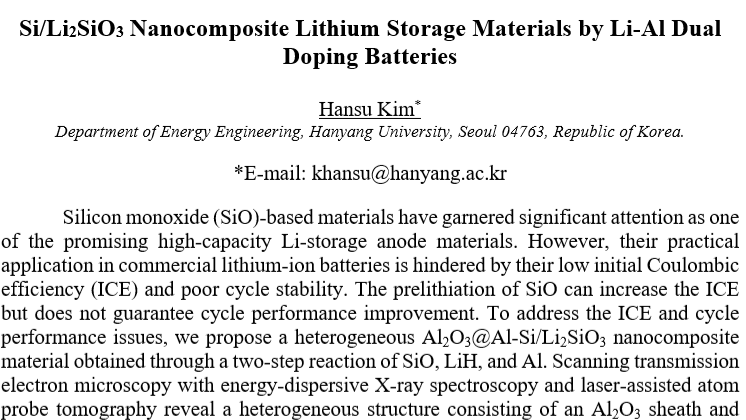 Silicon monoxide (SiO)-based materials have garnered significant attention as one of the promising high-capacity Li-storage anode materials. However, their practical application in commercial lithium-ion batteries is hindered by their low initial Coulombic efficiency (ICE) and poor cycle stability. The prelithiation of SiO can increase the ICE but does not guarantee cycle performance improvement. To address the ICE and cycle performance issues, we propose a heterogeneous Al2O3@Al-Si/Li2SiO3 nanocomposite material obtained through a two-step reaction of SiO, LiH, and Al. Scanning transmission electron microscopy with energy-dispersive X-ray spectroscopy and laser-assisted atom probe tomography reveal a heterogeneous structure consisting of an Al2O3 sheath and inner Si/Li2SiO3 nanocomposite, with a concentration gradient between them. The resulting Al2O3@Al-Si/Li2SiO3 nanocomposite material exhibits a high ICE of up to 89% and capacity retention of 72.8% after 200 cycles. The high structural stability induced by the core–sheath architecture plays a critical role in mitigating volume expansion and enhancing cycle performance.