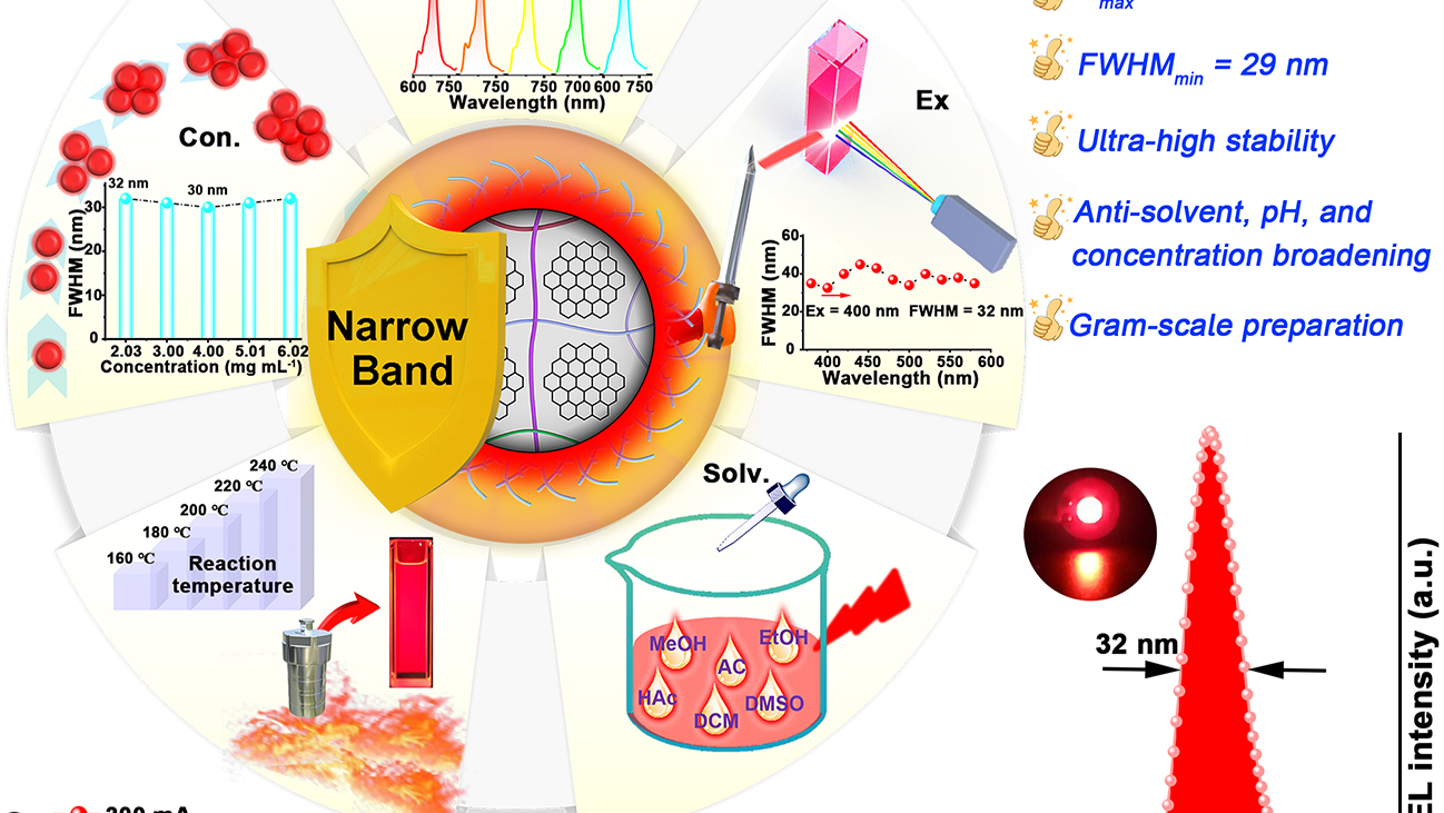 The broad-band emision of carbon dots (CDs) has been a key bottleneck restricting their application in high-color-purity optoelectronic devices,such as wide color gamut displays. To address this fundamental challenge, we propose a rational synthesis strategy to achieve full-color narrow-band emision from carbon dots. Through meticulous core-shell stucture engineering,by selecting highly symmetric precursors and fine-tuning reaction kinetics, we successfully achieved the tunable fabrication of high-color-purity near-infrared CDs,achieving a maximum emision wavelength of 704 nm and a minimum half-width of 29 nm. The superior performance of these narrow-band CDs has been validated in practical display prototypes. By integrating blue, gren,and red CDs onto a UV chip,a white light-emitting diode (W-LED) was fabricated. This device exhibits an extremely wide color gamut, covering 114% of the NTSC standard, fully demonstrating the high color purity of our materials and their application potential in next-generation display technologies. In summary,this work provides a fundamental design principle for overcoming the inherent broadband emision problem of carbon dots. It establishes narowband emision carbon dots as a viable,high-performance, heavy metal-free alternative to traditional quantum dots for use in demanding display applications.