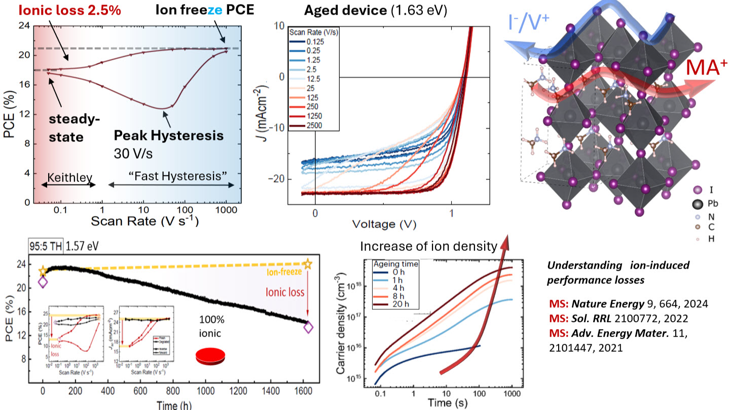 As Si cells are reaching their fundamental limits, silicon/perovskite tandem solar cells are considered to be the next-generation mainstream technology. These and other perovskite-based tandem solar cells usually rely on wide-bandgap (WBG) mixed halide perovskites. However, these cells are always more or less limited by ion migration and halide segregation (HS), which is a critical factor for operational stability.[1] In this talk, I will discuss the intriguing correlation between HS, ion density, and ionic loss evolution in wide-bandgap perovskite solar cells. This also includes how recovery effects seen in HS segregation relate to a recovery in ion density and ionic losses. Related to this, I will also discuss irreversible ionic losses, which stay “locked-in” after prolonged illumination and are therefore critical for the operational stability. I will then elaborate on strategies to mitigate mobile ion-induced performance degradation. This includes pure-iodine, dimethylammonium (DMA)-stabilized WBG perovskites, which are not only efficient (>22% certified) and stable under maximum power point tracking (T80 lifetimes exceeding 8700 h), but also demonstrate notable performances under combined photothermal stressors (light + 85 °C).