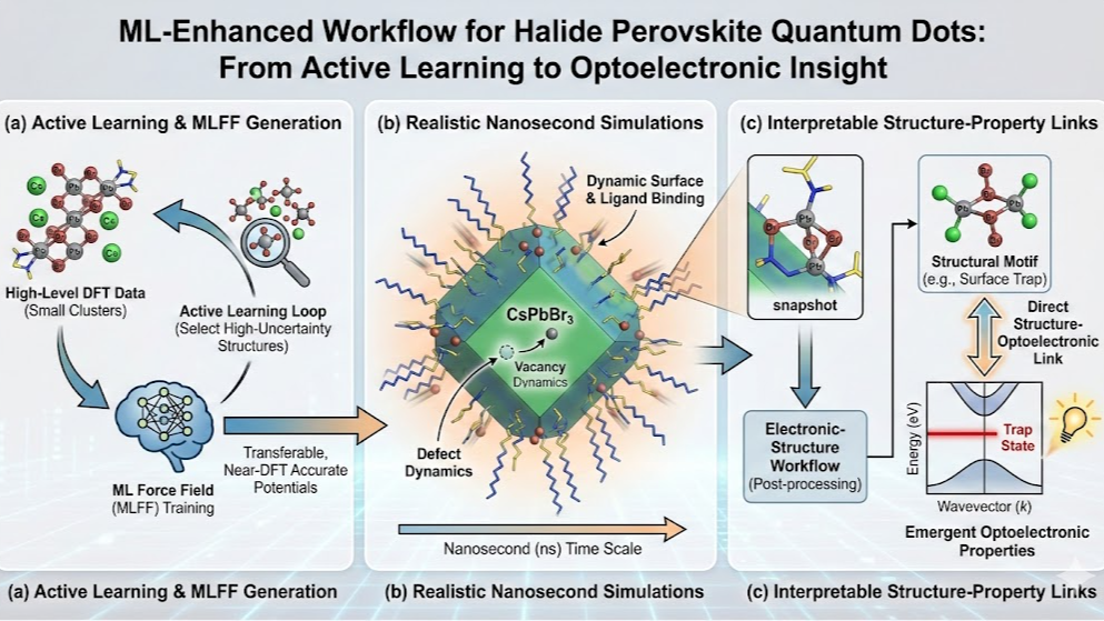 Metal halide perovskite quantum dots (PQDs) continue to challenge computational chemistry due to their structural softness and highly dynamic surface chemistry. In our group, we combine high-level DFT with molecular dynamics to generate next-generation machine-learning force fields (MLFFs) capable of capturing these complexities across realistic time and length scales. By curating cross-material datasets and integrating active learning, we train transferable MLFFs that describe ligand binding, surface reconstruction, and defect dynamics with near-DFT accuracy. These models unlock nanosecond molecular dynamics for CsPbBr₃ PQDs, providing statistically meaningful insight into the mechanistic processes that occur at PQD surfaces and their associated energy landscapes. We complement this with interpretable electronic-structure workflows that directly link structural motifs to emergent optoelectronic properties. This talk will show how machine learning enhanced simulations are reshaping our understanding of halide-perovskite QDs and highlight the methodological advances needed to achieve predictive, chemically aware MLFFs for complex, technologically relevant nanomaterials.