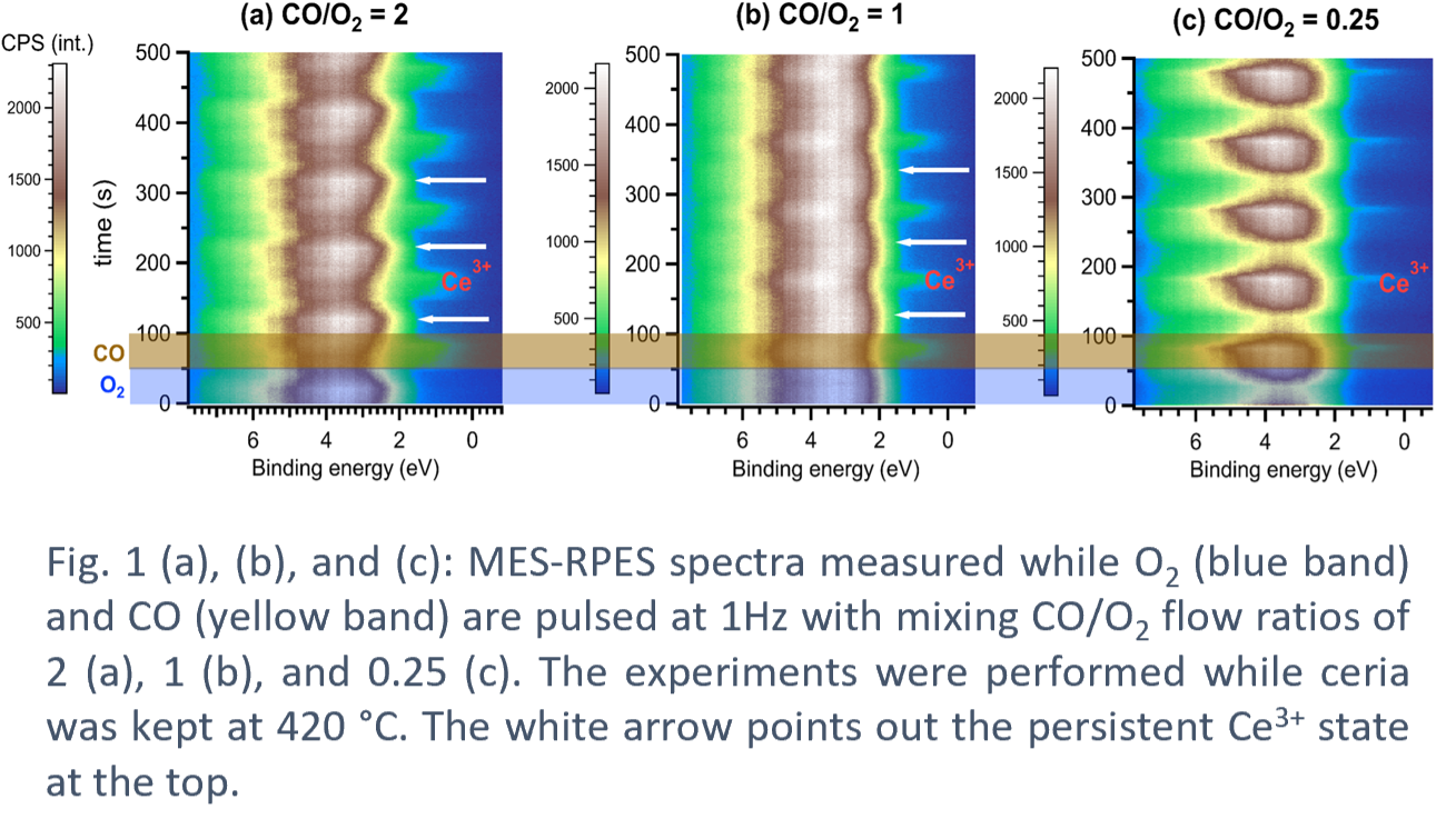 Many in situ, surface-sensitive studies assume that the most detectable surface species explains catalytic activity, overlooking fast, short‑lived species. Here, we combine modulation excitation (MES)[1] with resonant photoelectron spectroscopy (RPES)[2] to follow transient valence‑band signals during CO oxidation on ceria. Alternating O2 and CO pulses every 40 seconds switches the surface between Ce4+ and Ce3+. RPES tracking of Ce 4f (Fig. 1), together with simultaneous O2 and CO mass spectrometry, shows Ce3+ forming under CO and vanishing under O2 in repeatable cycles.