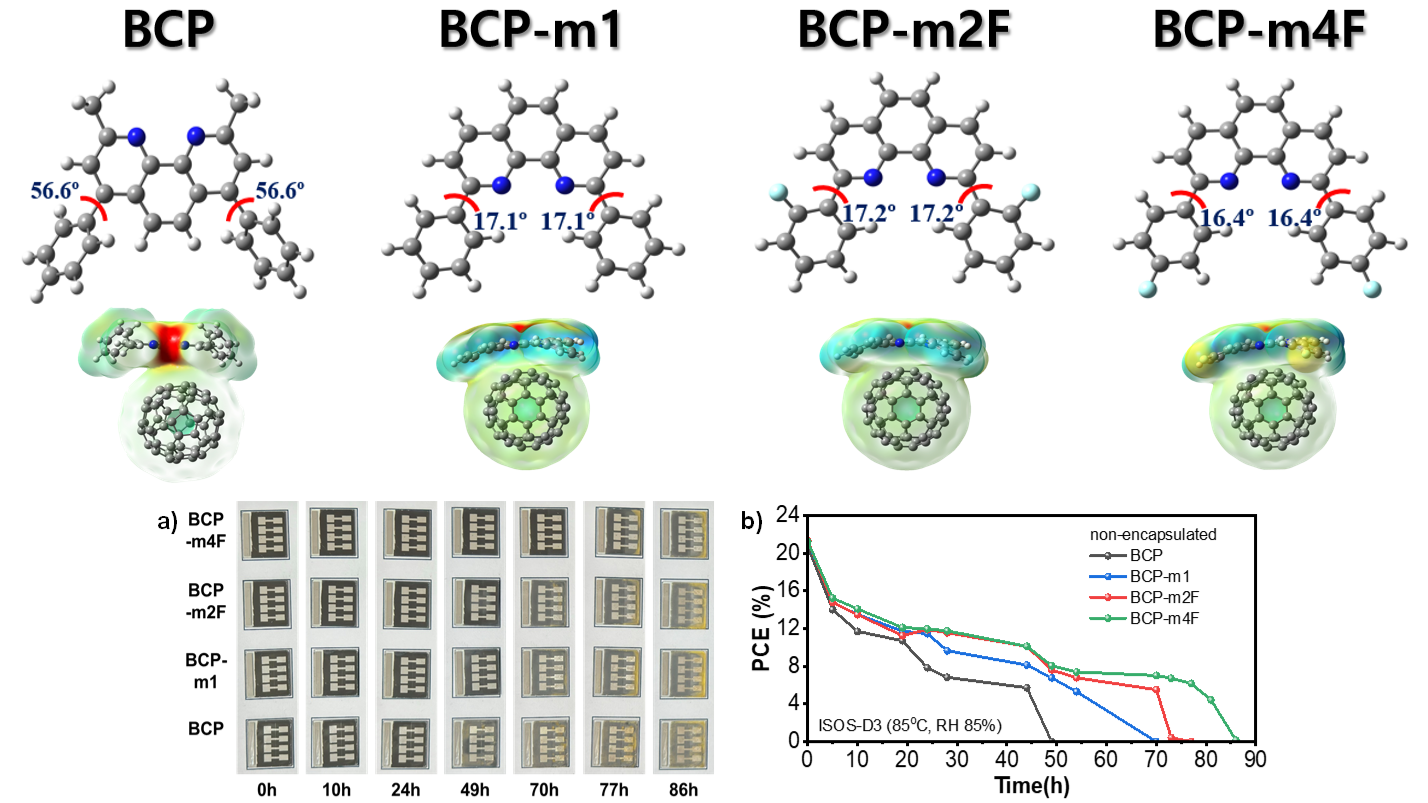 Interface engineering plays a decisive role in governing charge extraction, energetic alignment, and long-term stability in perovskite solar cells (PSCs). Building upon this framework, we report two newly designed fluorinated bathocuproine (BCP) derivatives—BCP-m2F and BCP-m4F—that incorporate site-selective mono-fluorination on the terminal phenyl units. These materials were developed as an extension of our previously reported BCP-m1, in which aryl substitution was introduced to enhance molecular planarity and improve charge-transport pathways. In contrast, the present work focuses on strategic fluorination as a means to simultaneously manipulate intermolecular interactions, interfacial energetics, and environmental robustness, while retaining the desirable structural motif of the parent BCP scaffold.