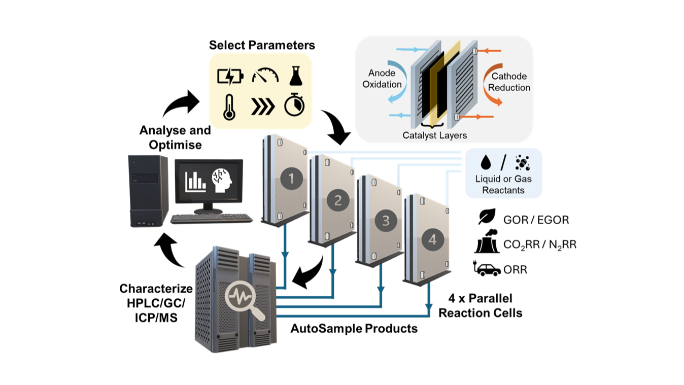 Many industrial chemicals are currently derived from non-renewable petroleum feedstocks, but electrochemical conversion of renewable biomass waste offers a more sustainable alternative. We have developed a high-throughput, automated electrolyser system designed to optimize the electrocatalytic production of lactic acid from glycerol at the anode, while simultaneously generating clean hydrogen at the cathode. The custom-built system can autonomously run up to 16 reactions, systematically varying key parameters of temperature, applied current, electrolyte flow rate, and concentration. Reaction products are analysed using a 96-vial HPLC autosampler, integrated with a data analysis program to quantify product yields. These results are fed into a Bayesian optimization algorithm (PHYSBO), which employs a Gaussian process to predict and select the next set of experimental conditions.1 The chosen conditions are automatically updated into the experimental run program, initiating the next round of testing. This self-driving electrocatalysis platform tailors reaction conditions to each catalyst, ensuring optimal performance and a foundation for material comparison.