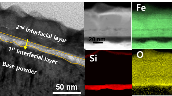 Interface engineering of powder-based materials is essential for improving the performance and reliability of energy materials used in energy conversion and storage, including batteries, electrocatalysts, and magnetic materials [1, 2]. Interparticle interfaces in powder-based components often govern local charge transport, electric-field localization, secondary phase formation and energy-loss mechanisms ultimately determining energy efficiency and reliability. Therefore, introducing coating layers onto individual particle, which functions as a interfacial layer in bulk materials, has been proposed as a common strategy to control interfaces in powder-based component. However, conventional powder-surface coating techniques, such as sol–gel processing and ball milling, often suffer from non-uniform coverage and limited capability for precise nanoscale thickness control. Moreover, residual solvents, surface defects, or by-products remained on particle surfaces during process can deteriorate interfacial stability and long-term reliability. Herein, we introduce rotary-reactor powder sputtering as a solvent-free and precisely controllable route for depositing various shell layers on powder-based energy materials. The proposed sputtering system incorporates a rotary reactor that is designed to continuously disperse and reorient powders, enabling uniform plasma exposure over nonplanar particle surfaces and thereby forming conformal interfacial layers with precisely controlled thickness. This approach was applied to deposit a nanoscale Bi2O3 interfacial layer on Fe-based alloy powders widely used for energy-conversion applications. Correlative X-ray photoelectron spectroscopy (XPS) and in situ transmission electron microscopy (TEM) analysis were performed to investigate interfacial phase transformations as a function of annealing temperature, revealing a correlation between the interfacial evolution and the efficiency of energy conversion. By uniformly and precisely controlling the interphase, an optimized interfacial layer resulting from a thickness of 40 nm Bi2O3 onto Fe-based magnetic powder showed a substantial reduction of 45.6% in power loss and a 2.2-fold increase in magnetic permeability, indicating enhanced energy-storage capability, compared with the uncoated bare powder. In addition, another example of powder surface coating, energy storage materials is also presented focusing on microstructural analysis and reliability. Overall, the precisely controlled coating layer on powder surface significantly enhance performance and reliability in their applications, highlighting rotary-reactor powder sputtering as a practical and scalable route for precision interface engineering.