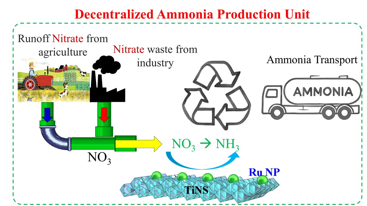 The decentralized electrocatalytic conversion of nitrate pollutants to ammonia represents a promising dual-purpose strategy for sustainable green ammonia synthesis and water remediation. However, its widespread application is constrained by the lack of selective, stable, and cost-effective catalysts that perform robustly across varied operational conditions. This work addresses this challenge by developing a hybrid catalyst in which highly crystalline, well-dispersed ruthenium nanoparticles (Ru NPs), synthesized via a green polyol process, are uniformly anchored onto microscale monolayer titania nanosheets (TiNS). A series of catalysts with controlled Ru loadings (5, 25, and 40 wt%) were systematically evaluated for the nitrate reduction reaction (NO₃RR) to ammonia. Comprehensive electrochemical testing under varying pH, applied potential, temperature, and nitrate concentrations revealed that the 25%Ru-TiNS catalyst exhibits optimal performance, achieving high selectivity and efficiency for ammonia production. In-situ Raman and infrared spectroscopic studies elucidated the critical role of Ru in facilitating proton supply in alkaline media, whereas both Faradaic efficiency and ammonia production rate declined significantly in acidic environments. This study provides a rational design strategy for efficient hybrid NO₃RR electrocatalysts and offers fundamental insights into the reaction mechanism, advancing the prospect of renewable, decentralized ammonia production from nitrate-laden waste streams.
