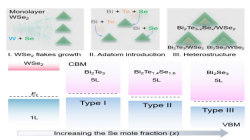 Band alignment engineering is crucial for facilitating charge separation and transfer in optoelectronic devices, which ultimately dictates the behavior of Van der Waals heterostructures (vdWH)-based photodetectors and light emitting diode (LEDs). However, the impact of the band offset in vdWHs on important figures of merit in optoelectronic devices has not yet been systematically analyzed. Herein, the regulation of band alignment in WSe2/Bi2Te3-xSex vdWHs (0 ≤ x ≤ 3) is demonstrated through the implementation of chemical vapor deposition (CVD). A combination of experimental and theoretical results proved that the synthesized vdWHs can be gradually tuned from Type I (WSe2/Bi2Te3) to Type III (WSe2/Bi2Se3). As the band alignment changes from Type I to Type III, a remarkable responsivity of 58.12 A W−1 and detectivity of 2.91×1012 Jones (in Type I) decrease in the vdWHs-based photodetector, and the ultrafast photoresponse time is 3.2 μs (in Type III). Additionally, Type III vdWH-based LEDs exhibit the highest luminance and electroluminescence (EL) external quantum efficiencies (EQE) among p-n diodes based on Transition Metal Dichalcogenides (TMDs) at room temperature, which is attributed to band alignment-induced distinct interfacial charge injection. This work serves as a valuable reference for the application and expansion of fundamental band alignment principles in the design and fabrication of future optoelectronic devices.
