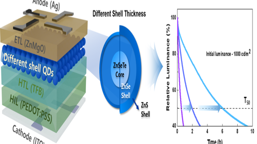 ZnSeTe-based quantum dots have attracted increasing attention as promising blue emitters due to their favorable electronic structure and optical properties.3 Despite recent progress in achieving high EQEs, ZnSeTe-based QLEDs still suffer from insufficient operational stability, hindering their practical implementation in fully electroluminescent devices.4 Addressing this issue requires precise control over both the nanocrystal structure and the charge recombination environment within the emissive layer.