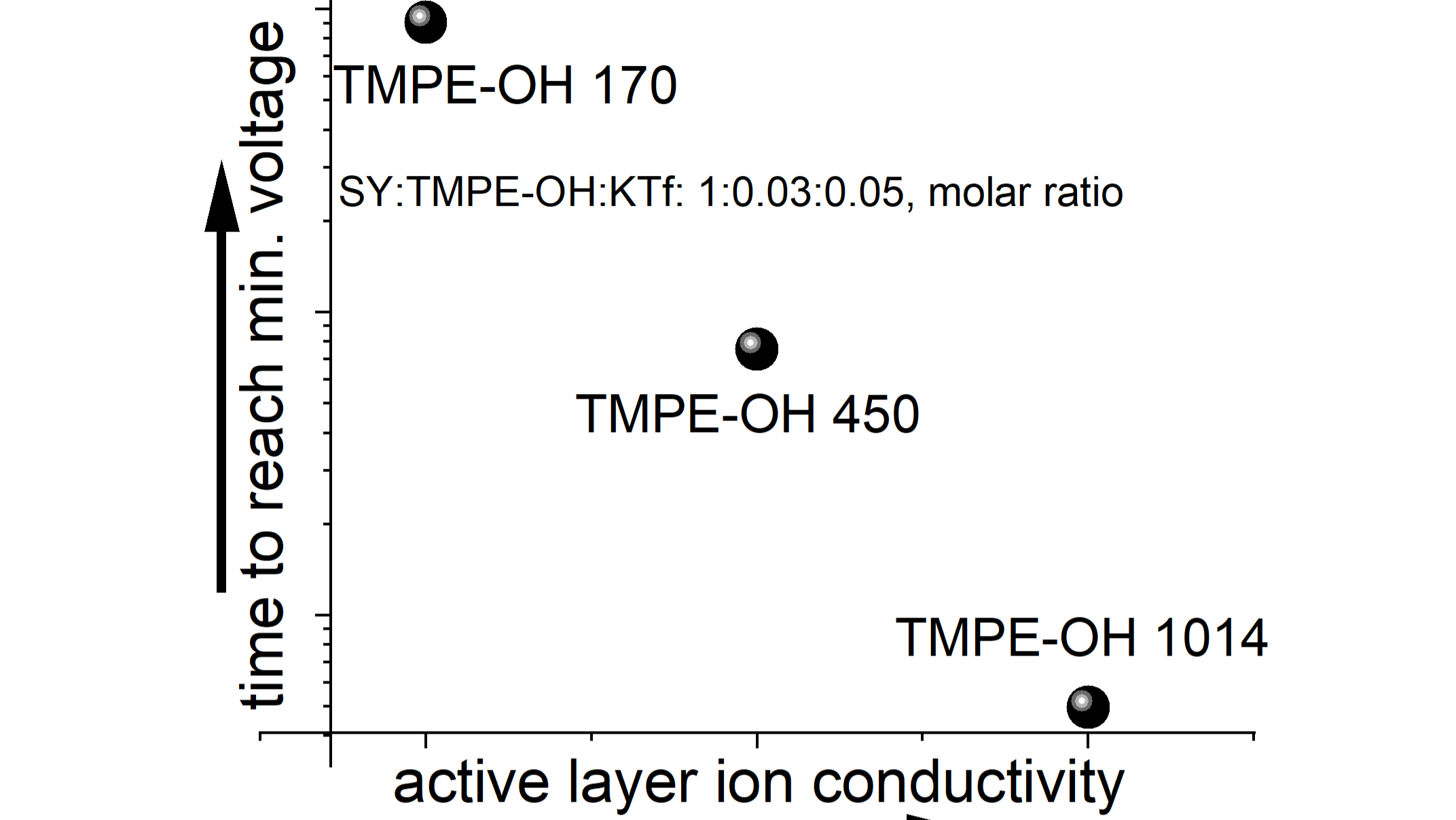 This study investigates the influence of the molecular weight of a hydroxyl‑capped trimethylolpropane ethoxylate (TMPE‑OH) ion transporter on the time to reach minimum voltage for an LEC, comprising KCF3SO3 as the salt and Super Yellow as the OSC. We find that the employment of the highest molecular weight TMPE-OH (Mn = 1014 g/mol) resulted in a much faster time to minimum voltage than two lower molecular weight counterparts (Mn = 170 and 450 g/mol). We employed impedance spectroscopy to show that the AL comprising the highest molecular weight TMPE-OH exhibited the highest ionic conductivity, and differential scanning calorimetry to show that it also featured the highest dissolution capacity for the KCF3SO3 salt. This implies that the AL based on the highest molecular weight TMPE-OH exhibits the highest concentration of mobile ions, which in turn rationalizes its higher ion conductivity and the lowest minimum voltage in LEC devices.
