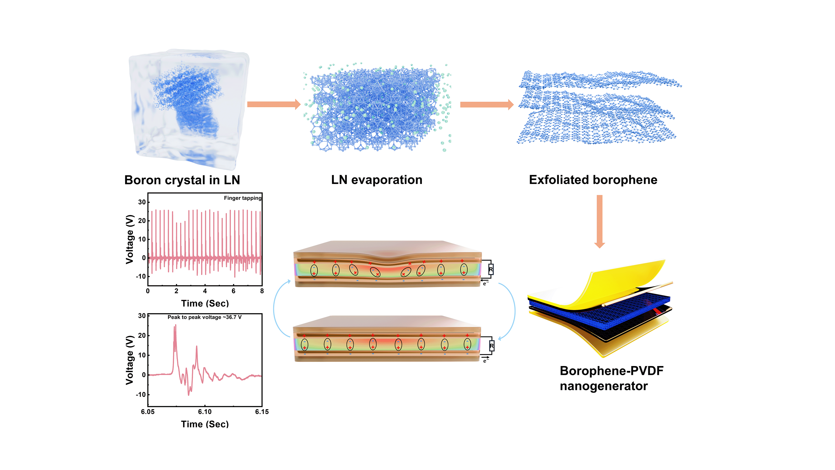 The resulting borophene nanosheets exhibit large lateral dimensions (up to 10 µm) and preserve the intrinsic metallic polymorphs with negligible oxidation, as confirmed by HRTEM and XPS analyses. To demonstrate its functional potential, the cryo-exfoliated borophene was integrated into polyvinylidene fluoride (PVDF) matrices to fabricate flexible piezoelectric and triboelectric nanogenerators. The incorporation of borophene significantly enhances the electroactive $\beta$-phase content and surface charge trapping capability of the composite. Consequently, the self-powered device delivers outstanding energy harvesting performance, generating voltage outputs of ~36.7 V under finger tapping and up to ~57.8 V under foot tapping. This work establishes a sustainable synthesis pathway for borophene and demonstrates its practical viability in self-powered wearable systems. [1]