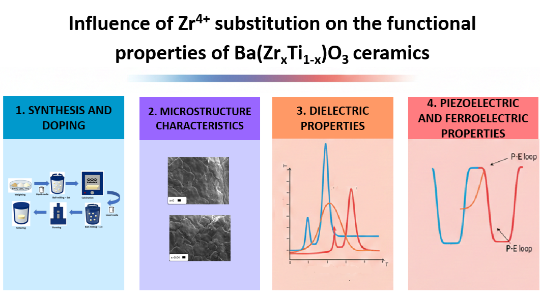 Ba(ZrxTi1–x)O3 ceramics, belonging to the perovskite family, are highly valued in modern electronics due to their ferroelectric and dielectric properties as well as their tunability. In this study, the influence of varying Zr/Ti ratios on the crystal structure and functional parameters of ceramics synthesized by the conventional solid-state method was examined. XRD analyses, microstructural observations, and dielectric measurements demonstrated modifications in the microstructure and controlled shifts in the phase transition temperature. The degree of titanium substitution by Zr⁴⁺ ions significantly affects the dielectric permittivity and the nature of the ferroelectric transformation, enabling the tailoring of ceramic properties for various technological applications. The obtained results confirm that BZT materials, due to their broad tunability and lead-free composition, represent a promising and environmentally friendly alternative for modern electronic devices. Furthermore, the systematic compositional control provides insight into structure–property relationships essential for optimizing performance in capacitors, actuators, and other multifunctional devices applications.