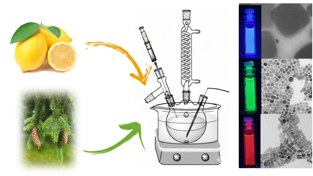 Here, we proposed the monoterpenes as alternative green solvents for the preparation of halide perovskites nanocrystals [1,2]. Specifically, limonene (R- and S-), α-pinene (1R- and 1S-) and β-pinene (1S-) have been selected due to their relative high boiling point, stability and natural origin. We succesfully synthesized CsPbX3 (X = Cl, Br, I) in form of nanocubes, nanoplates and nanorods and expanded the method also for the double perovskites. The synthesized NCs resemble the same structural and morphological properties of the homologues prepared in the common solvents, i.e. 1-octadecene with comparable optical properties. Moreover, exploiting the relative high volatility of these solvents under vacuum, we verified their quantitatively remotion from the final NCs limiting the washing step. The waste of the reactions can be distilled recovering pure solvent that can be reused for subsequent syntheses.