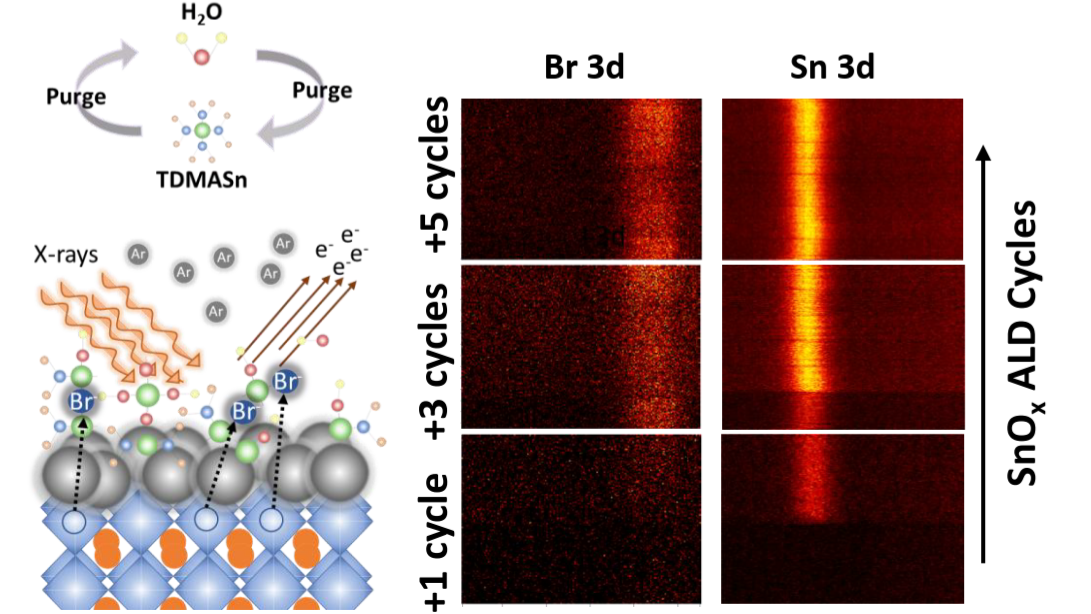 In this work, we performed in‑situ SnOx growth on various perovskite/C60 structures while simultaneously conducting ambient‑pressure XPS measurements at MAX IV synchrotron facility. Our results reveal that the initial ALD cycles of SnOx induce perovskite‑composition‑dependent ion migration through the C60 layer, which in turn affects both SnOx stoichiometry and growth‑per‑cycle behaviour. This ion migration is primarily triggered by chemical interactions between the Sn precursor and Br‑containing perovskite surfaces, with the Sn precursor first permeating through the C60 film. The direct interaction between SnOx precursors and perovskites of different compositions was further investigated using soft and hard XPS on samples where SnOx was deposited directly on FAPbI3 and FAPbBr3. The measurements clearly show degradation of the FA+ cation and formation of PbI2 in FAPbI3, as well as the formation of Sn–Br bonds in FAPbBr3 [4].