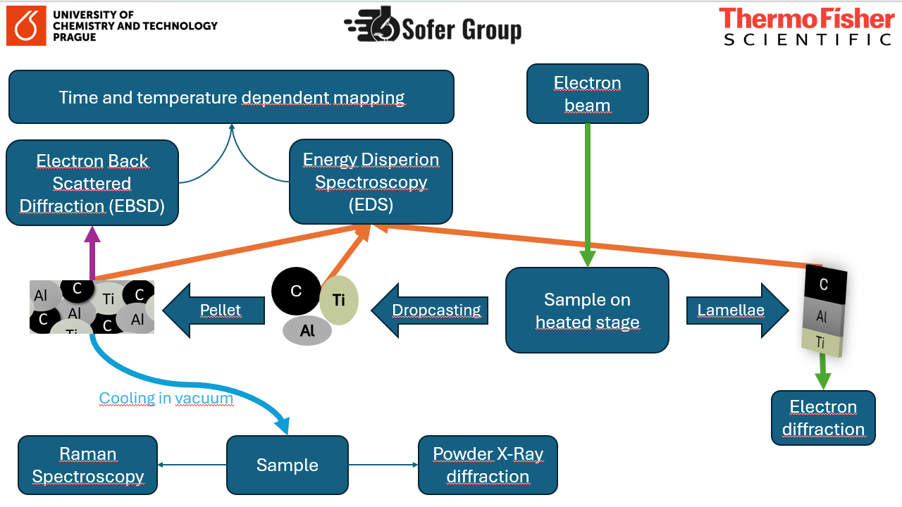 Several sample-preparation approaches were evaluated for the method, including simple drop casting of a precursor mixture (Ti, Al, and C powder elements in 3:1.1:2 [2], [4] and 3:1.2:1.8 stoichiometric ratios) in an ethanol suspension. The dried mixture was pressed into pellets to provide good contact between precursor elements (same stochiometric ratio as the powder mix) and polished using broad ion beam to ensure sufficient flatness of surface [1], [3] for SEM observation and TEM lamella preparation. This wide variety of approaches enables comprehensive, all-angle characterisation of the synthesis.