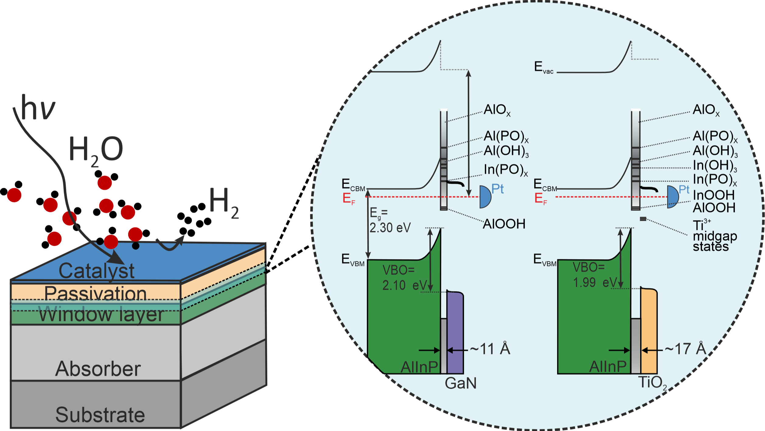 In addition, the interfacial chemistry and electronic structure at the GaN/III–V and TiO2/III–V heterointerface were analyzed. Photoemission spectroscopy showed that TiO2 deposition preserved a chemically complex AlInPOx interface composed of mixed III–O–P and oxy(hydroxide) bonding motifs, accompanied by mid-gap valence band features attributed to defect states such as Ti3+ species and residual hydroxides. These interfacial states indicate an unfavorable band alignment that can hinder efficient charge carrier transport. In contrast, plasma-enhanced ALD growth of GaN resulted in a cleaner interface. The N2 plasma pretreatment removed hydroxide species and resulted in the formation of P–N and P–O–N bonding configurations while maintaining the underlying phosphate network.