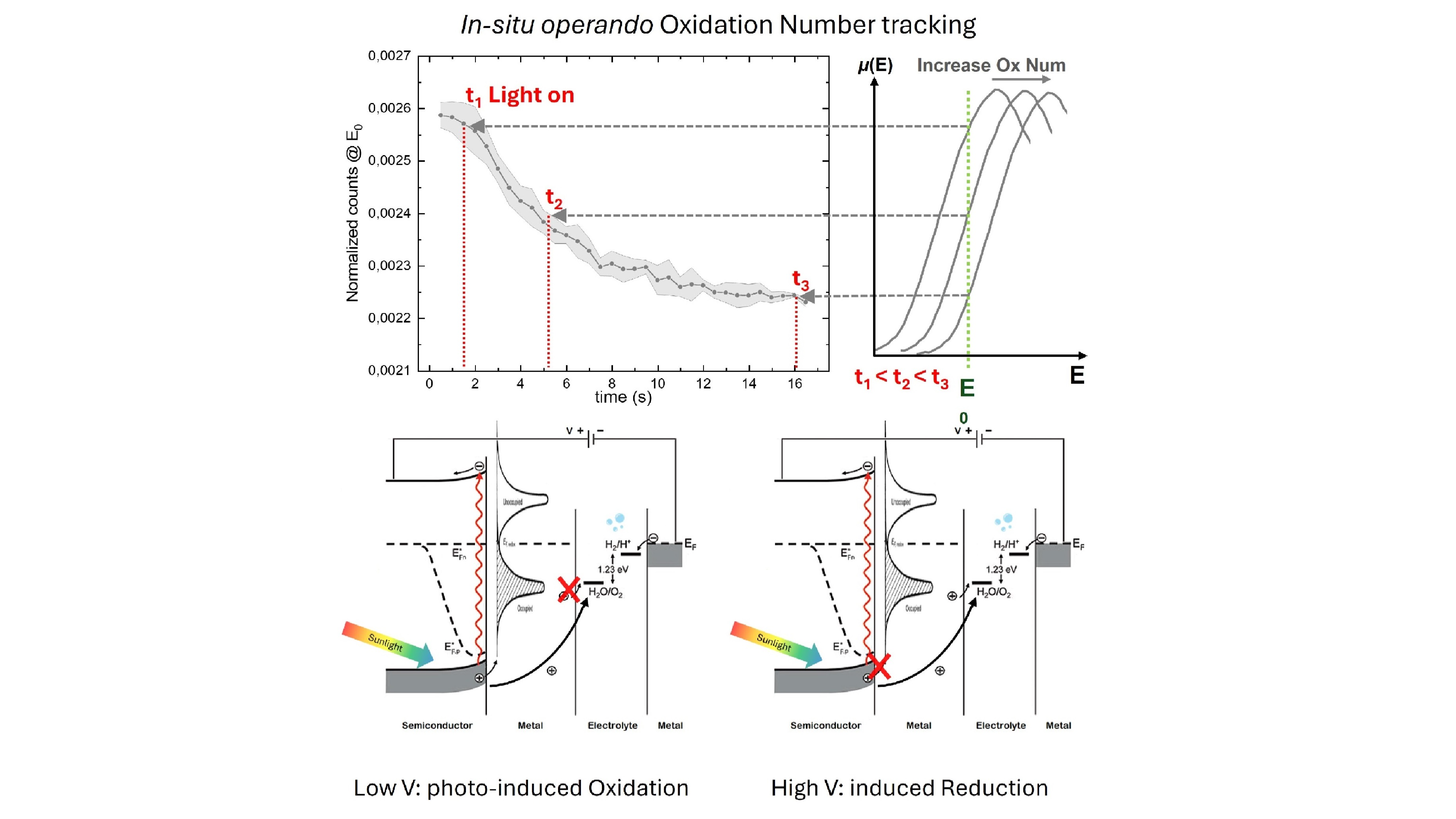 Nickel-based (oxy)hydroxides materials are among the most used electrocatalysts for alkaline oxygen evolution, and their catalytic activity is intrinsically linked to dynamic redox process that occur under applied bias [1]. In photoelectrochemical systems, these redox processes are influenced by photogenerated charge carriers from the semiconductor substrate too, making static characterization insufficient [2]. Operando techniques capable of tracking oxidation-state changes during operation are required to understand the interplay between semiconductor, cocatalyst, and electrolyte [2].