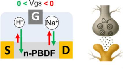 In this study, we examine the polymerization of n-doped poly[benzodifurandione] (nPBDF), a material recently recognized for its outstanding electronic performance and exceptional stability under ambient air conditions, and demonstrate its suitability for the fabrication of high-performance n-type organic electrochemical transistors (OECTs) for neuromorphic applications using protons as the primary mobile ions. The resulting nPBDF-based OECTs operate reliably in a NaPF₆ electrolyte, exhibiting stable behavior and the ability to function in both accumulation and depletion modes. These devices display resistive switching and synaptic plasticity driven by H+ ions from the electrolyte, as well as well-defined long-term potentiation (LTP) and long-term depression (LTD) characteristics at low gate voltages (0.8 V) and short pulse durations (50–500 ms). Their applicability to neuromorphic computing is further validated through simulations employing a deep neural network (DNN) model for handwritten digit recognition under varying levels of Gaussian noise, highlighting the potential of nPBDF-based OECTs for future (bio)electronic circuits, including biosensing and neuromorphic computing systems.