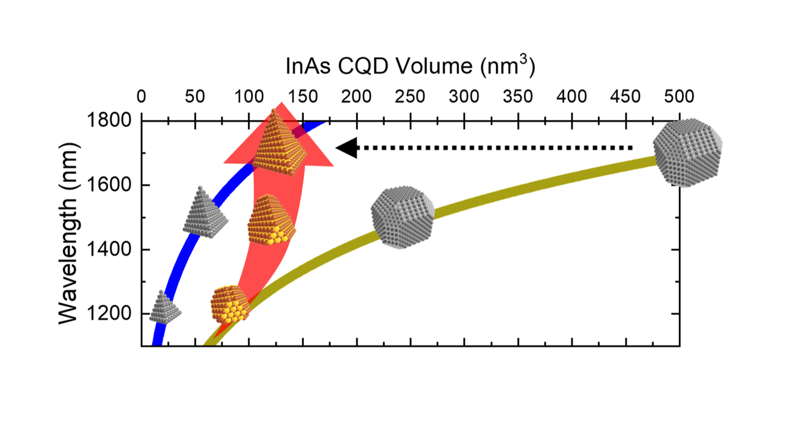 In this study, we report the synthesis of spherical amino-As-based InAs CQDs for the first time by manipulating surface ligand sterics. This finding implies that the conventional tetrahedral shape stems from the small bulkiness (low steric hindrance) of chloride (Cl) ligands. Furthermore, by systematically tuning the ligand ratio, we induced a "shape-driven" morphological transition from sphere to tetrahedron during growth. Through this morphological evolution, we successfully achieved deep-SWIR absorption at 1.7 μm with an exceptional volumetric efficiency—requiring only a 1.7-fold volume increase, effectively bypassing the 6.4-fold increase expected in conventional growth models.