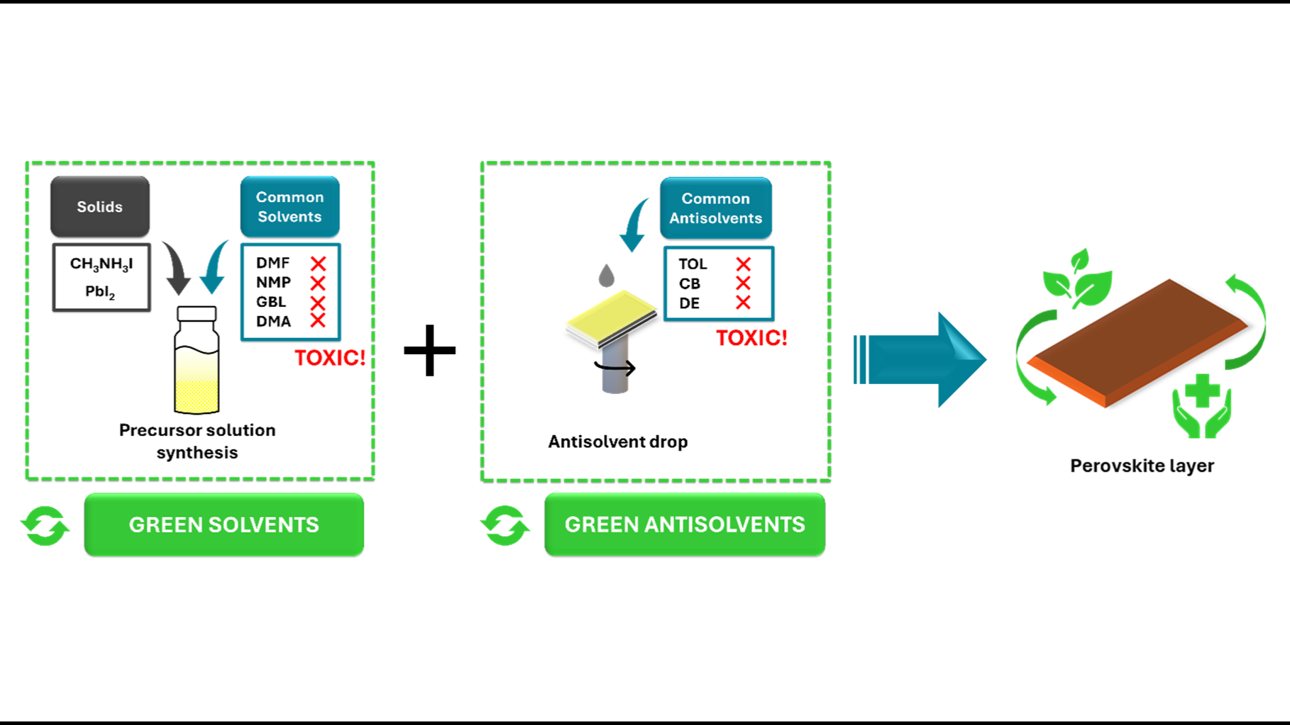 Perovskite solar cells (PSCs) are one of the most promising emerging technologies in the field of photovoltaic devices, achieving competitive efficiencies of 27% for lab-scale cells.[1] To facilitate their transition to industrial production, low-cost and solution-based methods are preferred as a fabrication route.[2] However, this route relies on the use of toxic solvents such as N,N-dimethylformamide (DMF) in dissolving the perovskite precursors or chlorobenzene (CB) as an antisolvent to aid the crystallization of the perovskite thin film. Both have been found to pose risks to human health and environmental safety.[3] As such, this has become one of the major barriers in the scale-up of PSCs.[4] It is therefore necessary to identify green and sustainable solvent alternatives to advance the development of PSCs on the industrial scale. While the PV community has started to explore potential solvents, there remains substantial room for understanding how green solvents affect the different process steps during fabrication and the performance of the device.[5] This would provide more insight into the stable, reproducible, and scalable “wet” processing methods compatible with the industry.