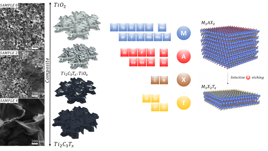 An example of this transformation is spontaneous oxidation of MXenes in aqueous dispersions, typically regarded as a degradation pathway, which can instead be seen as a versatile synthetic route for producing TiO₂ composites with tunable structural and electronic properties [2]. In this work, we investigate the controlled transformation of Ti₃C₂Tₓ MXene into carbon implemented titanium oxide nanostructures and demonstrate how the resulting evolution in morphology, band structure, and defect formation directly influences photocatalytic hydrogen generation in heterogeneous solid-gas conditions. Composites derived from highly oxidized “white” MXene solutions exhibit significantly improved semiconductor quality, evidenced by a reduction in Urbach energies and deliver markedly enhanced photocatalytic performance.