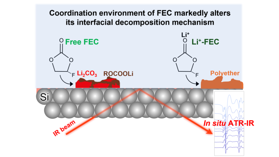 Here, we elucidate the SEI formation process on Si-based negative electrode in FEC-containing electrolytes by directly probing interfacial reactions in real time using in situ attenuated total reflectance infrared (ATR-IR) spectroscopy. This approach enables molecular-level identification of reaction intermediates and products during SEI formation. Our results reveal a detailed decomposition pathway of FEC and demonstrate that its solvation structure critically determines its reaction destiny. In situ ATR-IR measurements show that free FEC decomposes via vinylene carbonate (VC) as an intermediate to form ROCOOLi, while an alternative FEC decomposition pathway yields Li₂CO₃. In contrast, Li⁺-coordinated FEC undergoes a distinct decomposition pathway, leading to the formation of polyether species. These findings establish that the coordination environment of FEC markedly alters its interfacial decomposition mechanism, leading to distinct SEI compositions. Our work highlights the pivotal role of solvent/additive coordination structure in governing interfacial reaction pathways and underscores the importance of solvation in rational SEI engineering.
