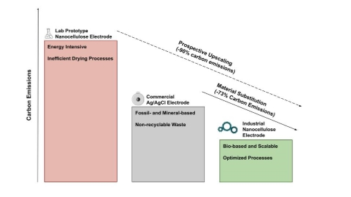 At the industrial scale, both nanocellulose electrodes achieved a 73% reduction in carbon emissions, and an 80% reduction in fossil resources use compared to commercial Ag/AgCl alternatives. Preliminary results indicate that the scaled-up electrodes reduce carbon emissions by 90% compared to laboratory prototypes, primarily due to the prospective optimization of the energy-intensive film drying processes. Scaling reversed the environmental ranking of the two pathways: while TEMPO exhibited 45% lower emissions than the enzymatic route at the laboratory scale, the enzymatic route proved superior at the industrial scale, outperforming TEMPO with 14% lower emissions.