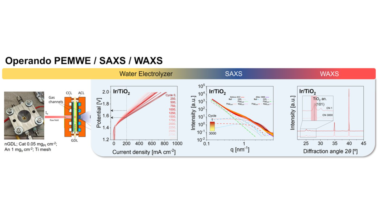 Ex situ characterization by transmission electron microscopy (TEM), energy-dispersive X-ray spectroscopy (EDX), and X-ray photoelectron spectroscopy (XPS) corroborates the operando observations. These results emphasize the interplay between nanoparticle Ostwald ripening and support degradation as key determinants of catalyst durability and underscore critical design considerations for catalyst–support architectures. Overall, this work highlights the capability of operando SAXS/WAXS applied to full MEAs to disentangle degradation pathways and to inform the development of more resilient anode materials for PEM electrolysis.