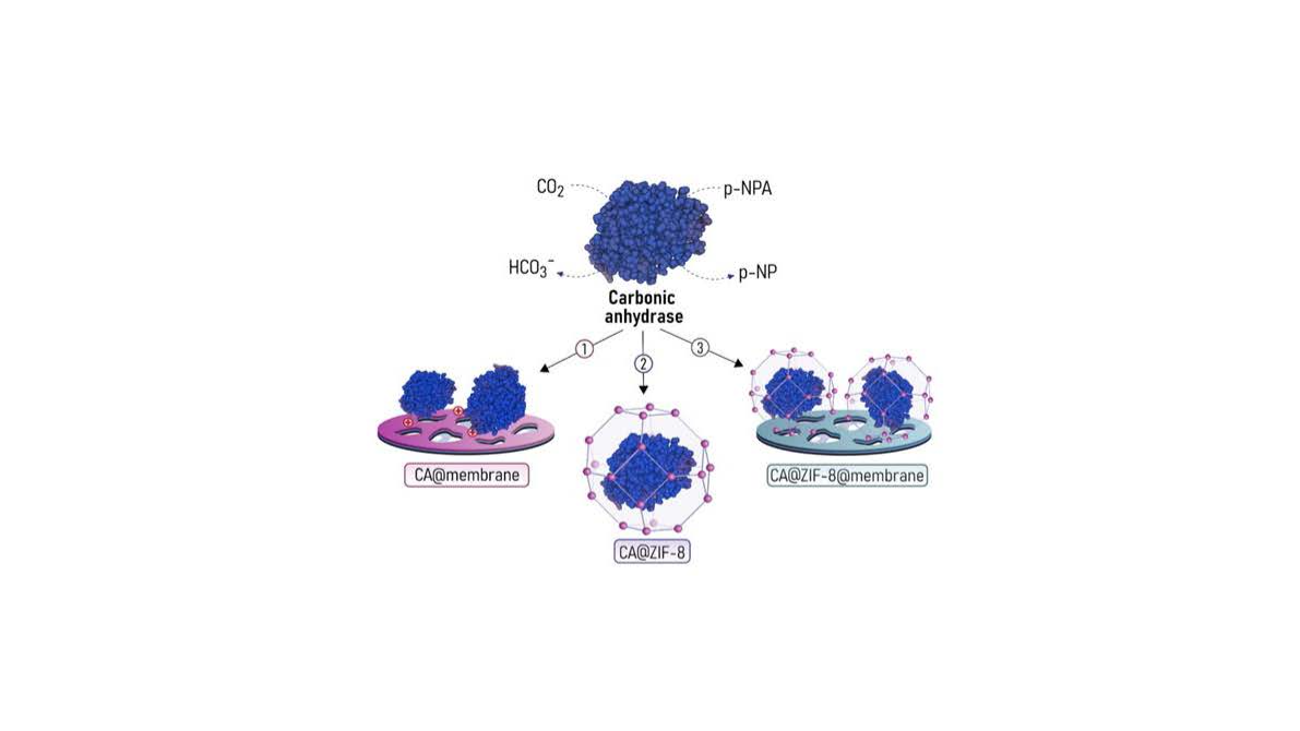 Carbonic anhydrase was selected as a model catalyst due to its exceptional intrinsic turnover for CO₂ hydration but well-known sensitivity to temperature, pH and industrial process conditions. To overcome these limitations, the enzyme was encapsulated within a zeolitic imidazolate framework (ZIF-8) and integrated onto polymeric membrane supports through polydopamine-assisted assembly and polyelectrolyte multilayers. This approach enables simultaneous control of enzyme microenvironment, catalytic accessibility and mass transport within a continuous-flow catalytic material. The resulting system can be described as a bio-hybrid catalytic membrane where the MOF provides structural and thermal protection, while the membrane reactor architecture enhances substrate delivery and product removal.