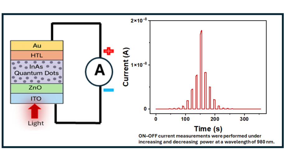 The increasing demand for cost-effective, high-sensitivity short-wavelength infrared (SWIR) photodetectors has driven significant research into solution-processable materials. Colloidal quantum dots (CQDs), particularly III-V semiconductors like InAs, offer a promising and RoHS-compliant alternative to traditional epitaxially grown InGaAs sensors, especially for applications in medical imaging, autonomous systems, and industrial inspection. While InAs CQDs present an attractive route to SWIR detection due to their size-tunable bandgap and non-toxic composition, the development of efficient photodiode architectures with optimized charge extraction layers remains crucial. In this work, we demonstrate a SWIR photodiode fabricated using InAs CQDs as the active absorbing layer, integrated with a carefully selected stack of solution-processed charge transport layers. The device architecture consists of ITO-coated glass as the transparent bottom contact, a hole-selective polymer layer to facilitate efficient hole extraction and block electrons, the InAs CQD active layer, a zinc oxide (ZnO) nanoparticle layer as the electron transport layer (ETL), and a top silver (Ag) metal contact. The energy level alignment between the polymer hole transport layer, the InAs CQDs, and the ZnO ETL creates a favorable cascade that drives efficient charge carrier separation and minimizes recombination losses. The device characterization reveals high photocurrent for visible (450 and 638 nm) and near infrared wavelengths (980 nm), see figure, confirming the effective function of the photodiode architecture. This study underscores the viability of combining InAs CQDs with tailored organic and metal-oxide charge transport layers to create high-performance, environmentally friendly SWIR photodetectors via low-cost, scalable fabrication methods.