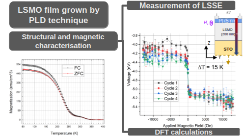 Among the mechanisms enabling spin-current generation, the longitudinal spin Seebeck effect (LSSE), driven by a vertical thermal gradient, represents a key phenomenon for spin-caloritronic applications, allowing the direct conversion of waste heat into spin and electrical signals[3]. In this work, we investigate the LSSE response in epitaxial La₁−ₓSrₓMnO₃ thin films with x ≈ 0.2. We focus in this x value due to its proximity to the ferromagnetic insulating–metallic phase boundary, where enhanced magnetic, electronic, and thermomagnetic responses are expected.
