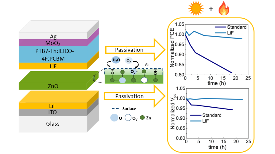 In this study, we first introduce an ultra-thin lithium fluoride (LiF) layer onto the ZnO surface as a passivation layer to mitigate degradation effects. LiF interacts with oxygen species on the ZnO surface, reducing the influence of oxygen vacancies arising from incomplete sol-gel processing. Successful passivation is confirmed by X-ray photoelectron spectroscopy (XPS) which shows a substantial reduction in surface oxygen content, leading to improved photostability of the cell.