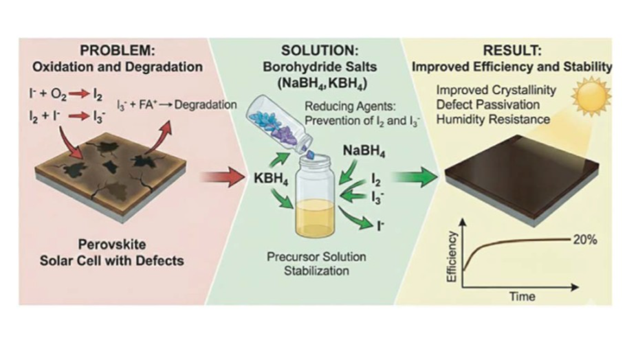 Here, solar cells fabricated with borohydride additives achieve efficiencies close to 20%, together with markedly improved durability. A particularly notable result is the long-term stability of unencapsulated CsFAPbI3 devices incorporating NaBH4 When stored strong under ambient conditions with 60% relative humidity at 25 °C. These devices retain stability for more than 900 hours after fabrication over five times longer than reference devices without additives. Furthermore, this demonstrates the strong protective effect of the reducing agent against moisture-induced degradation. These findings provide a promising pathway toward more reliable perovskite photovoltaics and contribute to overcoming one of the key challenges for their future large-scale commercialization.