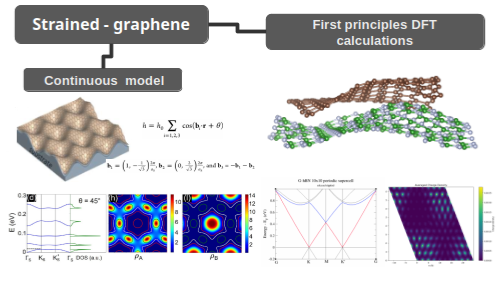 Furthermore, we observe the emergence of isolated bands associated with additional gaps at both higher and lower energies. Near the neutrality point, the bands exhibit a renormalization of the Fermi velocity, indicating an incipient strain-induced band narrowing. Finally, calculations of the local density of states (LDOS) reveal the development of spatially varying sublattice polarization across the membrane, a clear signature of out-of-plane deformation and strain-induced local symmetry breaking.