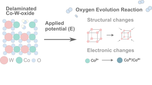 First-row transition metal oxides are being actively explored as earth-abundant catalysts for the oxygen evolution reaction (OER) in acid media. However, achieving high stability and reactivity poses a big challenge [1-4]. A recent study reported a strategy for the tailored delamination of a cobalt-tungsten-based oxide, which resulted in high OER activity and remarkable stability [4]. However, the mechanism by which the atomic and structural modifications of the solid impacted catalytic performance remains poorly understood. In this poster, I will present a study using complementary in situ UV-Vis spectroscopy, X-ray spectroscopy, and X-ray diffraction to track the structural and electronic changes [5, 6] in Co-W-based oxides before and during the OER. I will report optical and X-ray spectroscopy measurements, which track the formation of reaction intermediates and their interactions as a function of the applied potential. I will also discuss XRD data, evaluating how the lattice is dynamically modulated as a result of such interactions and during OER reactivity. This study provides insights into how electronic and structural changes are linked during OER and highlights strategies to improve catalyst efficiency and stability.