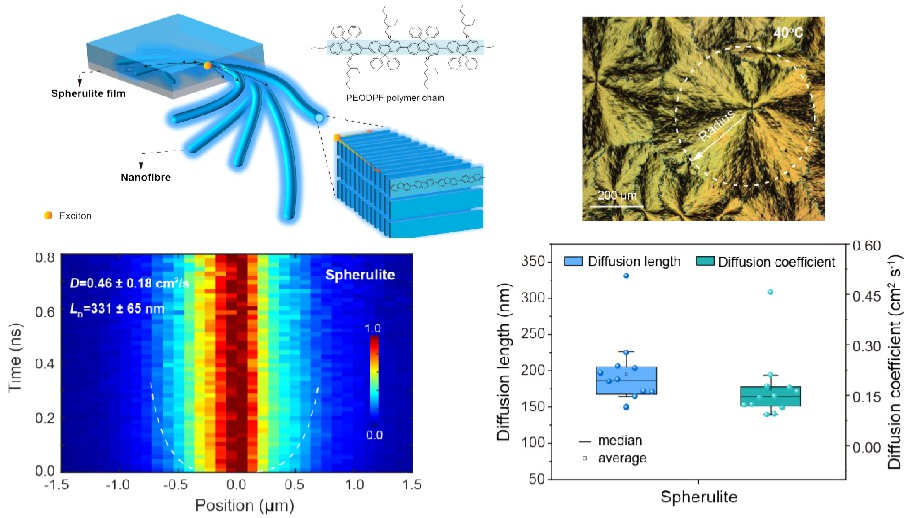 corresponding diffusion coefficient of 0.14 cm2 s -1 . Notably, the maximum value of exciton diffusion lengths and diffusion coefficient can reach up to approximately 396 nm and 0.63 cm2 s -1 , respectively. Well-ordered hierarchical structure with an outstanding chain alignment in spherulite provides a uniform excitonic energy landscape, enabling ultralong exciton diffusion. The reduced defect density in the spherulite film may result in shallower trap states, facilitating exciton diffusion and radiative recombination. Polymer light-emitting diodes based on submillimeter-scale spherulite films exhibit deep-blue electroluminescence with high brightness (4897 cd m-2 ) at low current density and good color purity. These findings demonstrate that the long-range ordered spherulite structure can significantly enhance the excitons transport and improve the overall optoelectronic property.