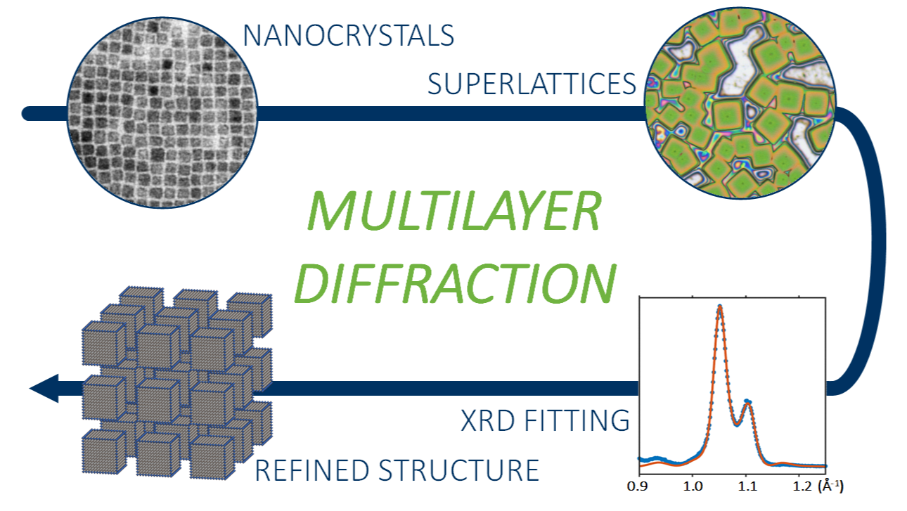 Here we present a novel approach to the characterization of periodically stacked colloidal nanocrystals, which was inspired by diffraction experiments on multilayers grown by molecular beam epitaxy.[2] Our method takes advantage of optical interference phenomena arising from the superlattice periodicity, which enrich the profile of Bragg peaks in structural information. By fitting these profiles, collected with a common lab-grade diffractometer, we can extract structural information usually requiring high-end setups such as synchrotrons. Our approach is especially suitable for bidimensional colloidal crystals like nanoplatelets and nanosheets, because they spontaneously assemble into stacked periodic structures thanks to their highly anisotropic shape. However, we expect that our approach can be also extended 2D-layered organic-inorganic materials, which are not considered superlattices but share with them the periodic alternation of different layers.