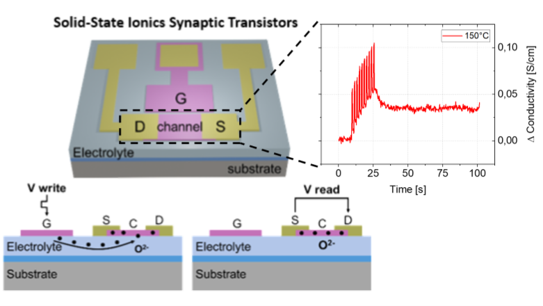 Among the different solutions suggested in literature, Electrolyte-Gated Transistors (EGTs) – which are essentially conventional Field-Effect Transistors (FETs) where the gate dielectric is replaced by an electrolyte with mobile ions – have recently been proposed. Many of these EGTs are based on the principle of ionic intercalation, utilizing the active kinetics of ions such as H+ or Li+. On the other hand, perovskite oxide materials hold large potential as EGTs due to their ability to be easily modified by oxide-ion intercalation, with oxide-ion insertion being more widely applicable than other types of ions. However, the drawback of the several orders of magnitude lower oxide-ion transport present a large drawback, especially in all-solid-state EGTs. The specific EGT studied in this research is a symmetric battery-like device in which oxide-ions are transferred between two mixed ionic-electronic conducting (MIEC) perovskite oxide thin-films (i.e. channel and gate) through a solid state electrolyte. In order to address the sluggish oxide-ion diffusivity, a superior oxide-ion conducting thin film of Bi2V1‑xCuxO(11/2)‑x (BICUVOX) with highest oxide-ion conductivities at low temperatures ever reported is used as low temperature electrolyte.[1] This EGT is manufactured by pulsed laser deposition (PLD), Photolithography and reactive ion milling. The conductance of the channel is controlled via a gate bias, allowing for oxide-ion intercalation between gate and channel as well as multistate operation in the millisecond range. In-situ electrical conductivity measurements at low temperatures (<150 °C) reveal fast and remarkable low energy consumption. Due to its multi-states, the presented EGT reveals synaptic features such as short- and long-term plasticity (STP, LTP), low asymmetric ratio during weight update and broad dynamic range which are known as fundamental properties of synaptic plasticity in biological neural networks. By this, the proposed synaptic transistor has the potential to lead to a breakthrough in energy efficiency and processor performance in information technology.